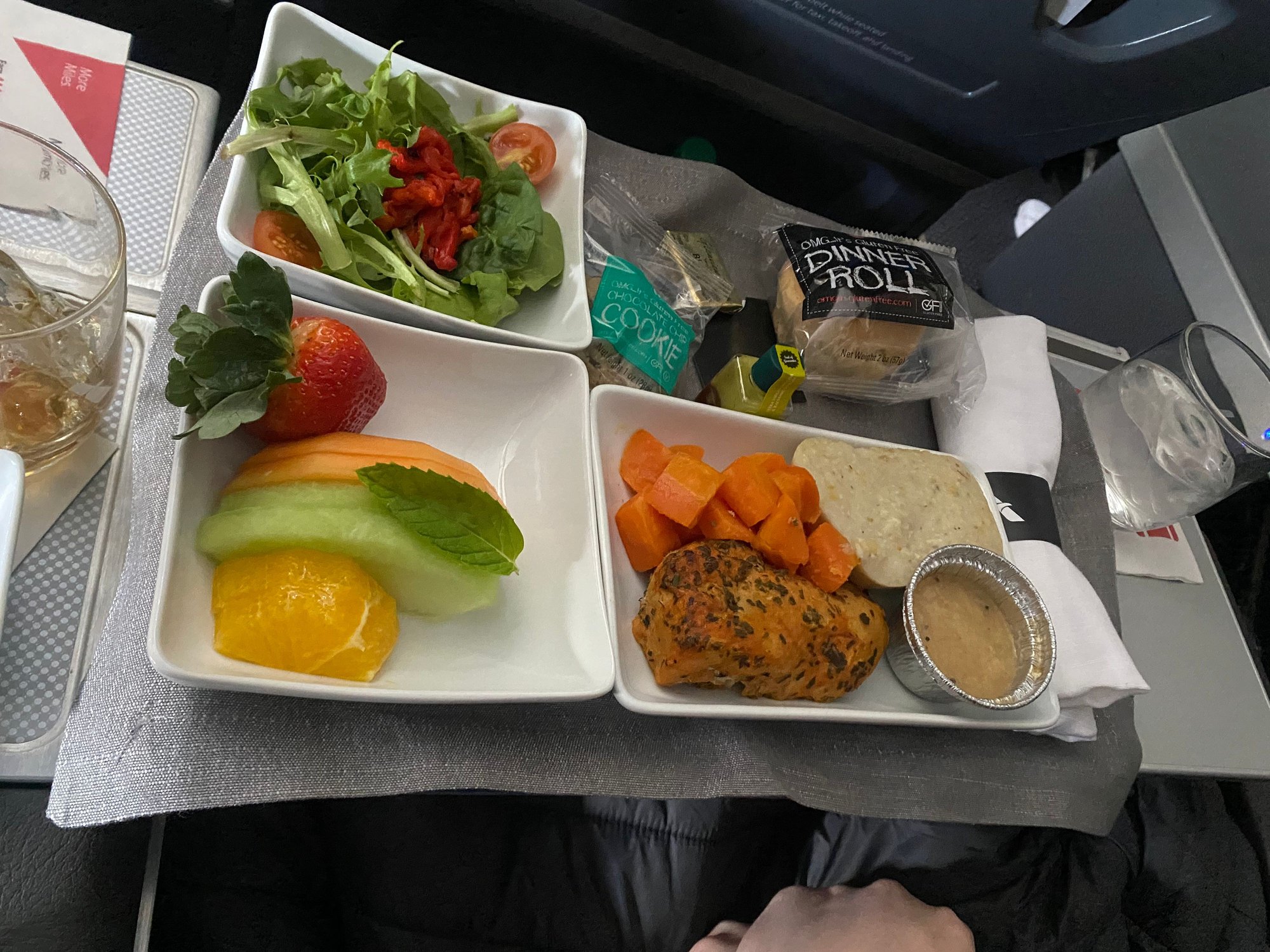 Preordered the Mediterranean Bowl but FA said it wasn’t loaded so was offered the Vegetarian plate which was an interesting concoction of flavors….think of curried flavored bulgur wheat with some hummus and pickled cauliflower……thought maybe it was an alternate version of the Mediterranean bowl, or some other special meal but since most of the people in F ended up with it not sure if it was a miscater or in normal