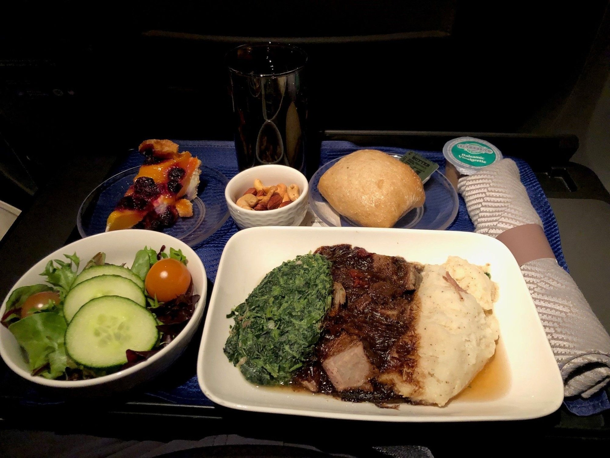After reading the reviews here, I decided on the BBQ Brisket. Meal service was incredibly slow. As in Glacially slow. Pleasant crew but....slow. Meal service lasted the whole flight. I was in 4F, but they were collecting finished and empty trays from row 1 before row 3 even got served. Anyway, I had higher hopes for the Brisket but the entree was served to me stone cold. It looked very good, but cold mashed potatoes and brisket aren't that appealing. Especially with all that juice, which I'm assuming was spinach runoff. I'll chalk this up to a one-off occurrence and would order it again.