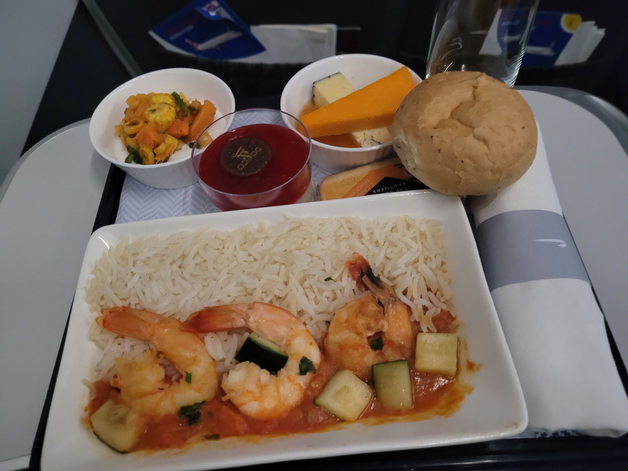 BA677 IST-LHR Band 4 Dep 18:50. The menus were not given out on this flight because they didn't match the meals loaded; I chose the 'pan fried prawns'. The prawns themselves were cooked well and a reasonable size, the rice had a nice buttery flavour, but the meal is let down by a nondescript sauce! Having said that, I would choose this meal again, over a veggie pasta meal or salad. The starter was nice.