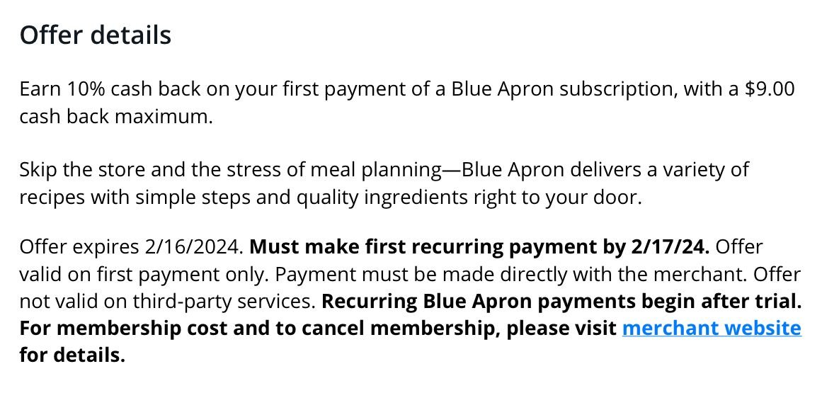 Does anyone have any experience with this - do they really only cover the first payment, or will it trigger if I switch my ongoing subscription to it now? And further, since I have it on more cards than I can use before 2/16, will it trigger if I buy a Blue Apron giftcards with each card?