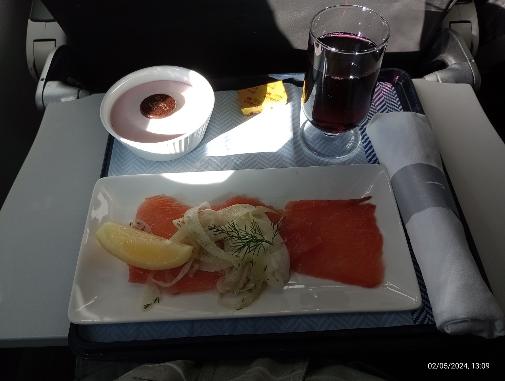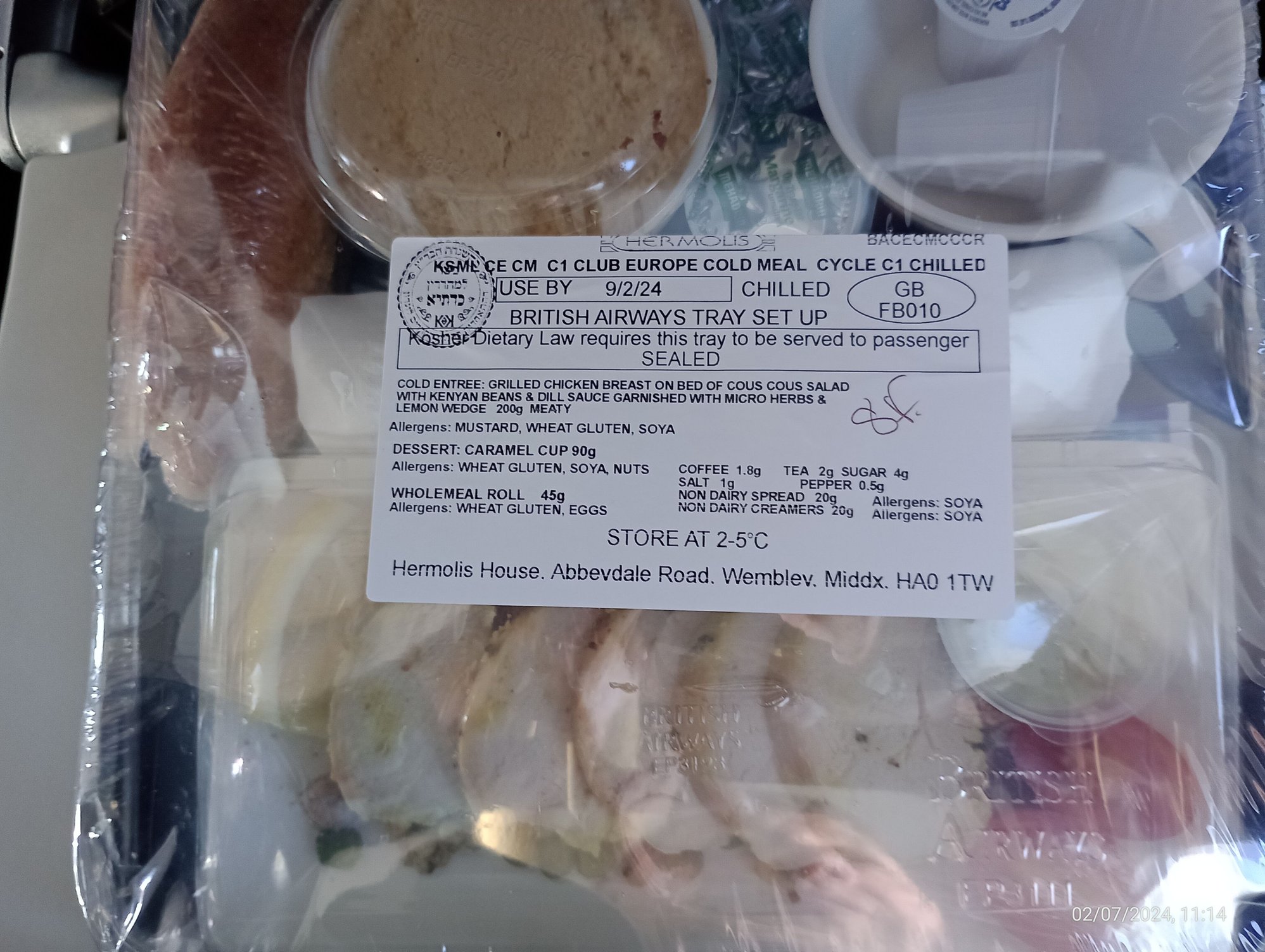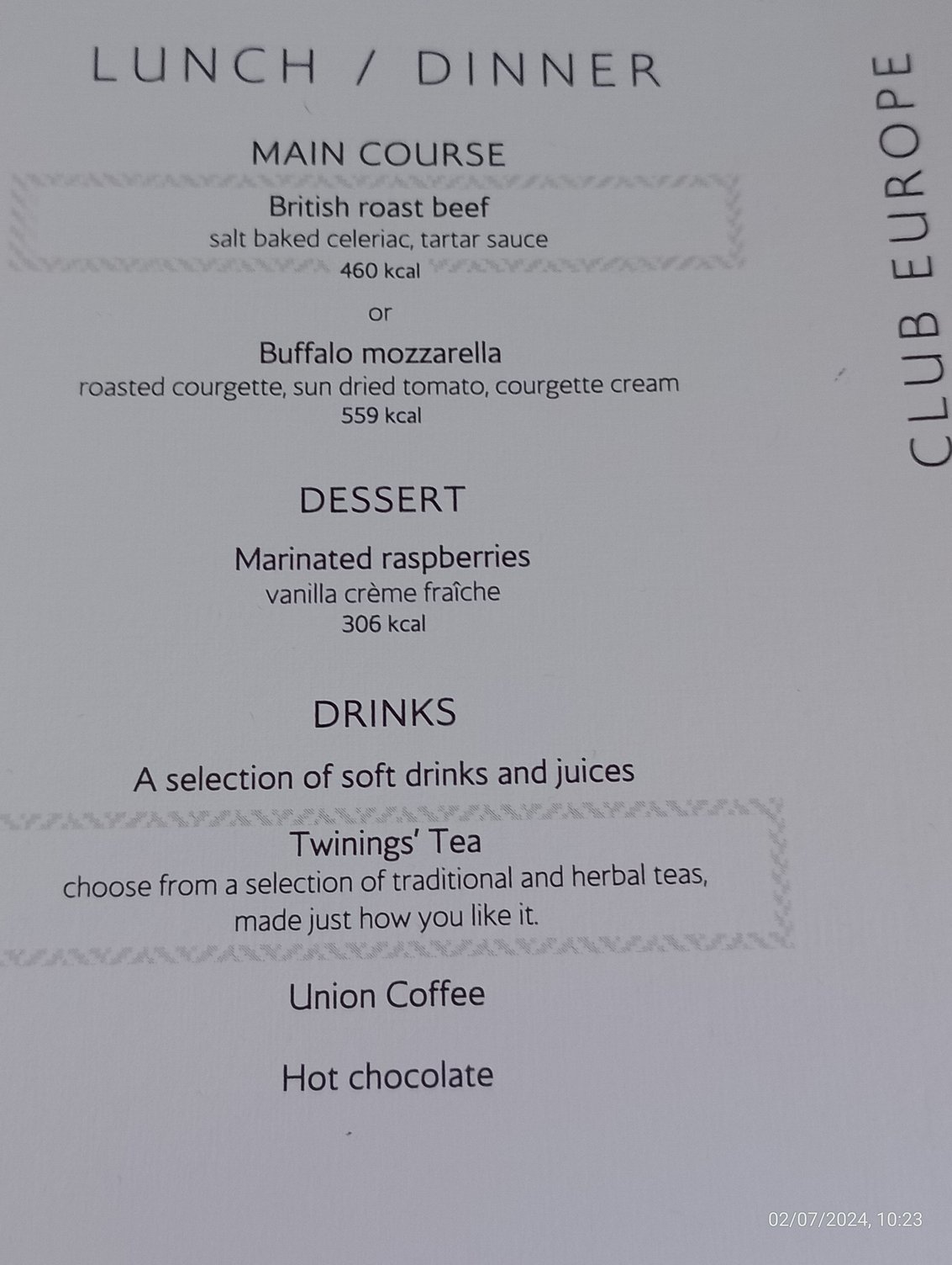 No menus handed out. Expected Kosher meal but informed no record of it. Choice was Salmon or Roasted Veg and I went for the former. Quite enjoyed the salmon although no roll ever appeared to go with the butter
