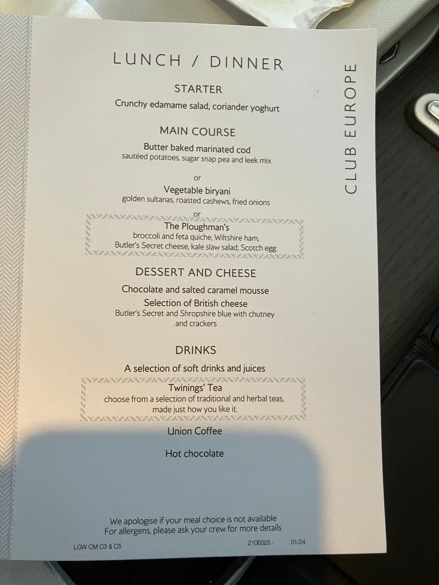 Anyway below is the menu, my cod (very tasty) and SWMBO had the Ploughman’s which she approved of (which is amazing because she has VERY high standards for airline food).