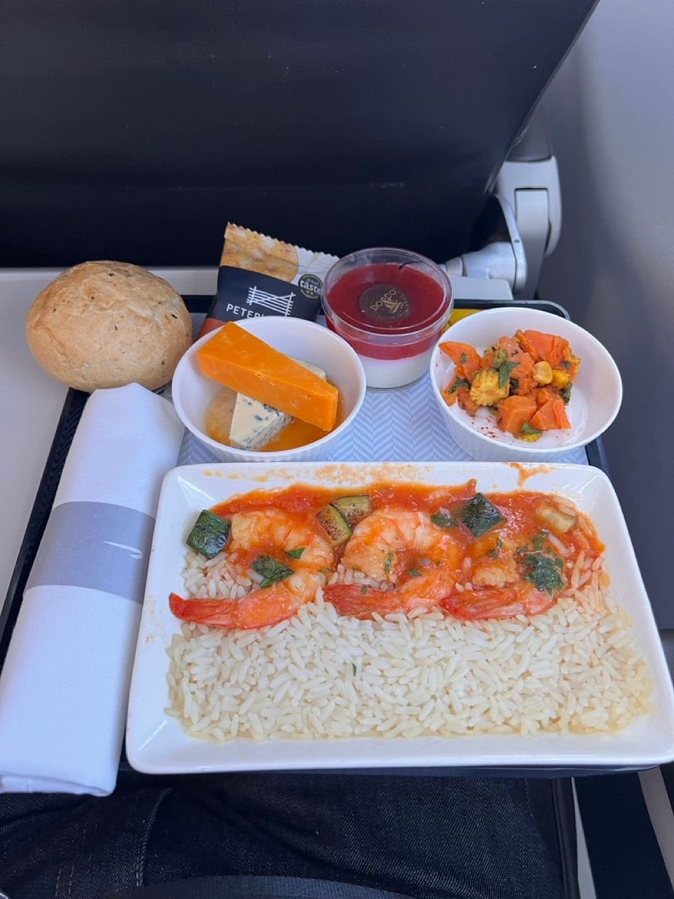 I was worried about the pan-fried prawns to be honest (mostly because it’s seafood served on the inbound flight), but went with the crew’s recommendation. And I’m glad I did. They were really good!
