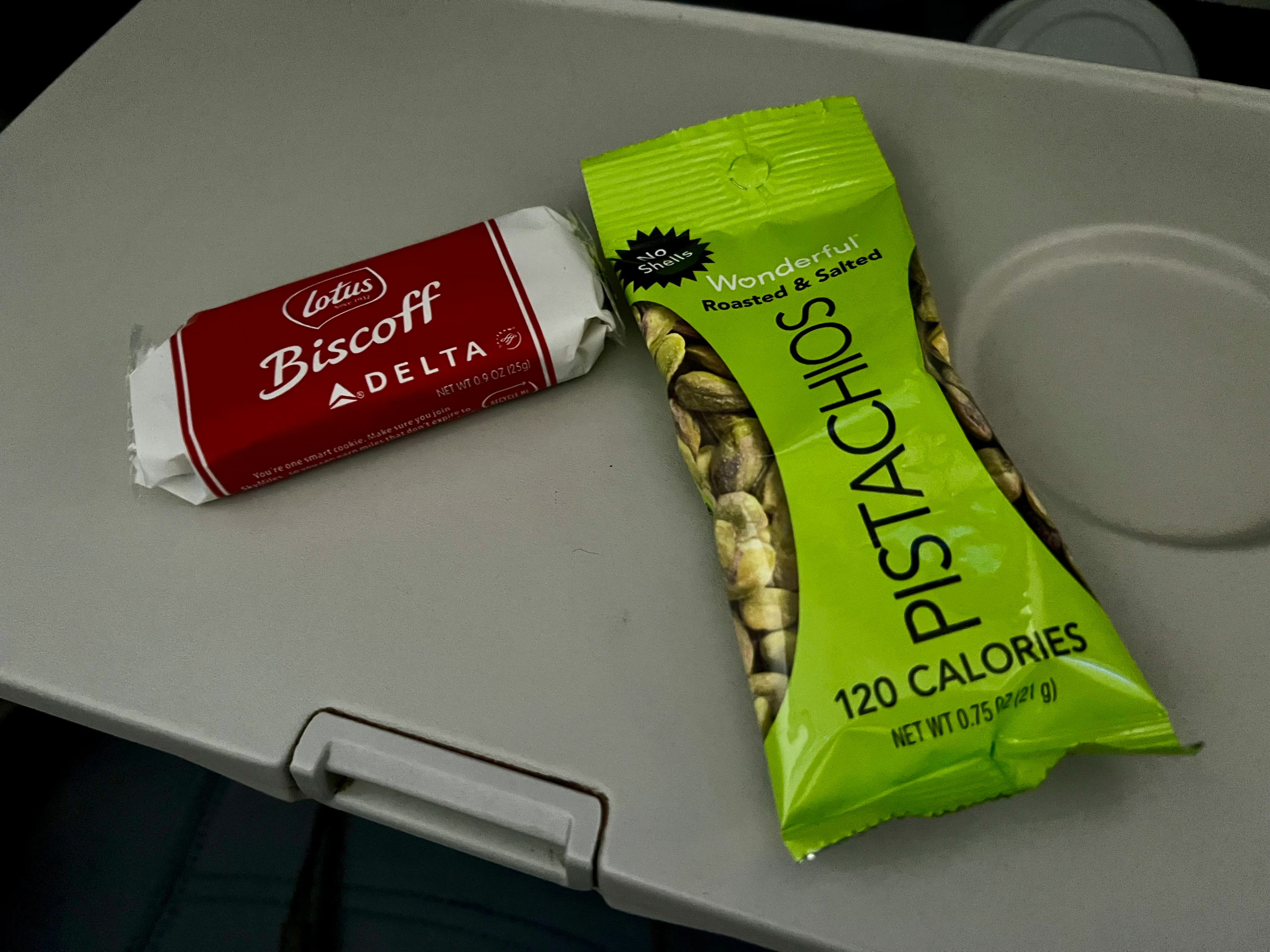 45 minutes after takeoff, our in-flight service began with a pass of the snack basket. This is one of the ways Delta differentiates Comfort+ from American's Main Cabin Extra and United's Economy Plus, with elevated snacks and complimentary alcoholic beverages on offer. AA has complimentary alcohol in MCE while United provides neither. I took some pistachios and a Biscoff cookie.