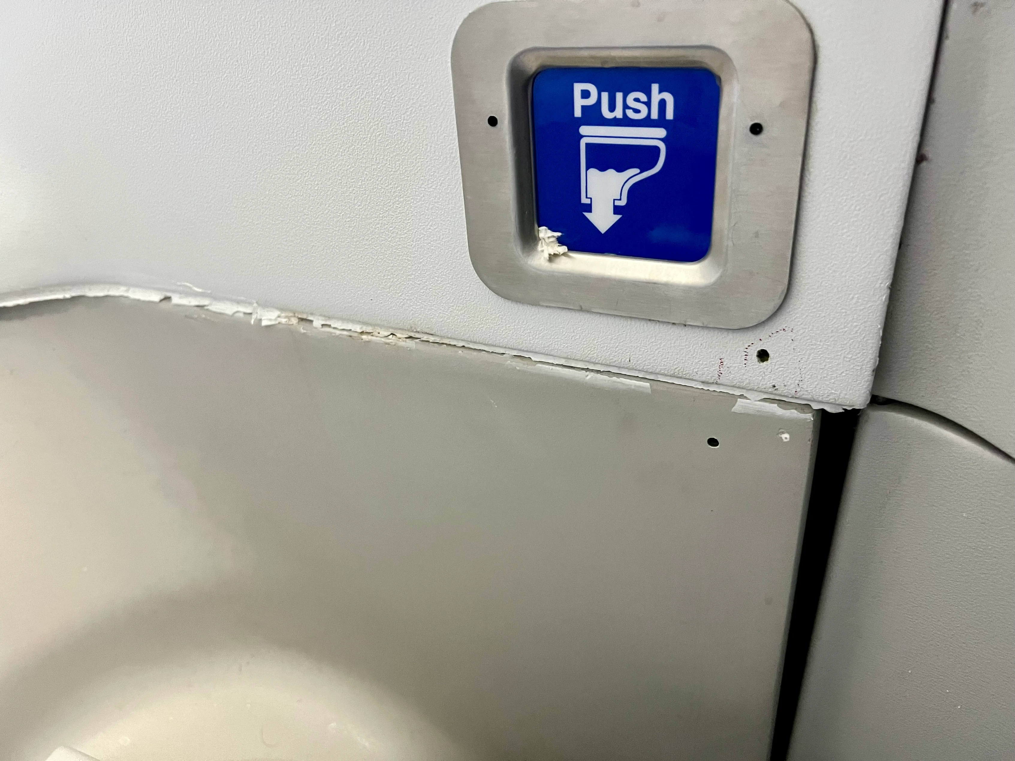 Towards the end of the flight I headed to the rear lavatory which was absolutely filthy and falling apart. Liquids were all over the floor and the panels in the lavatory were falling off in places. Hand towels weren't stocked in the dispenser and instead were sitting in a stack on the counter.