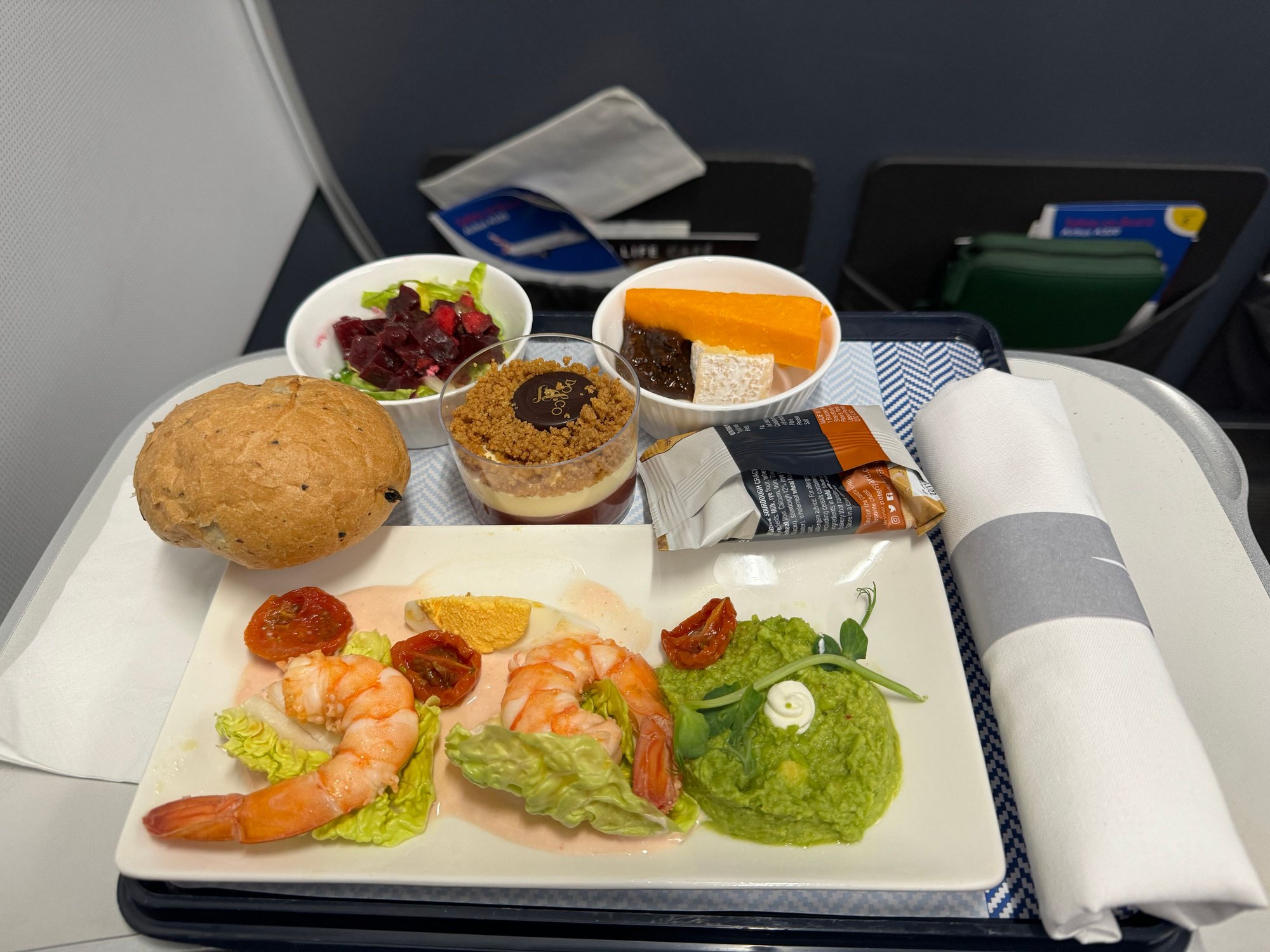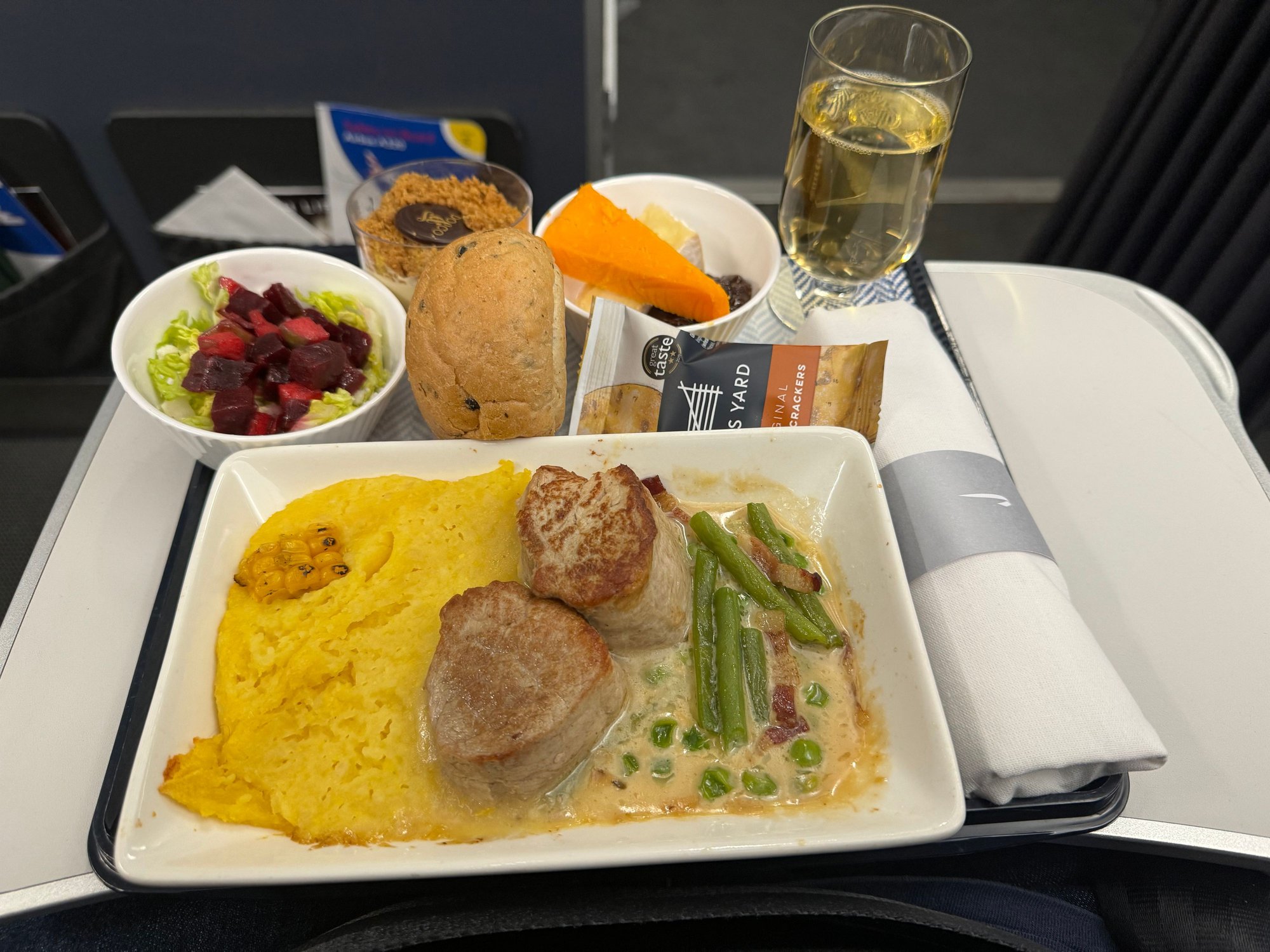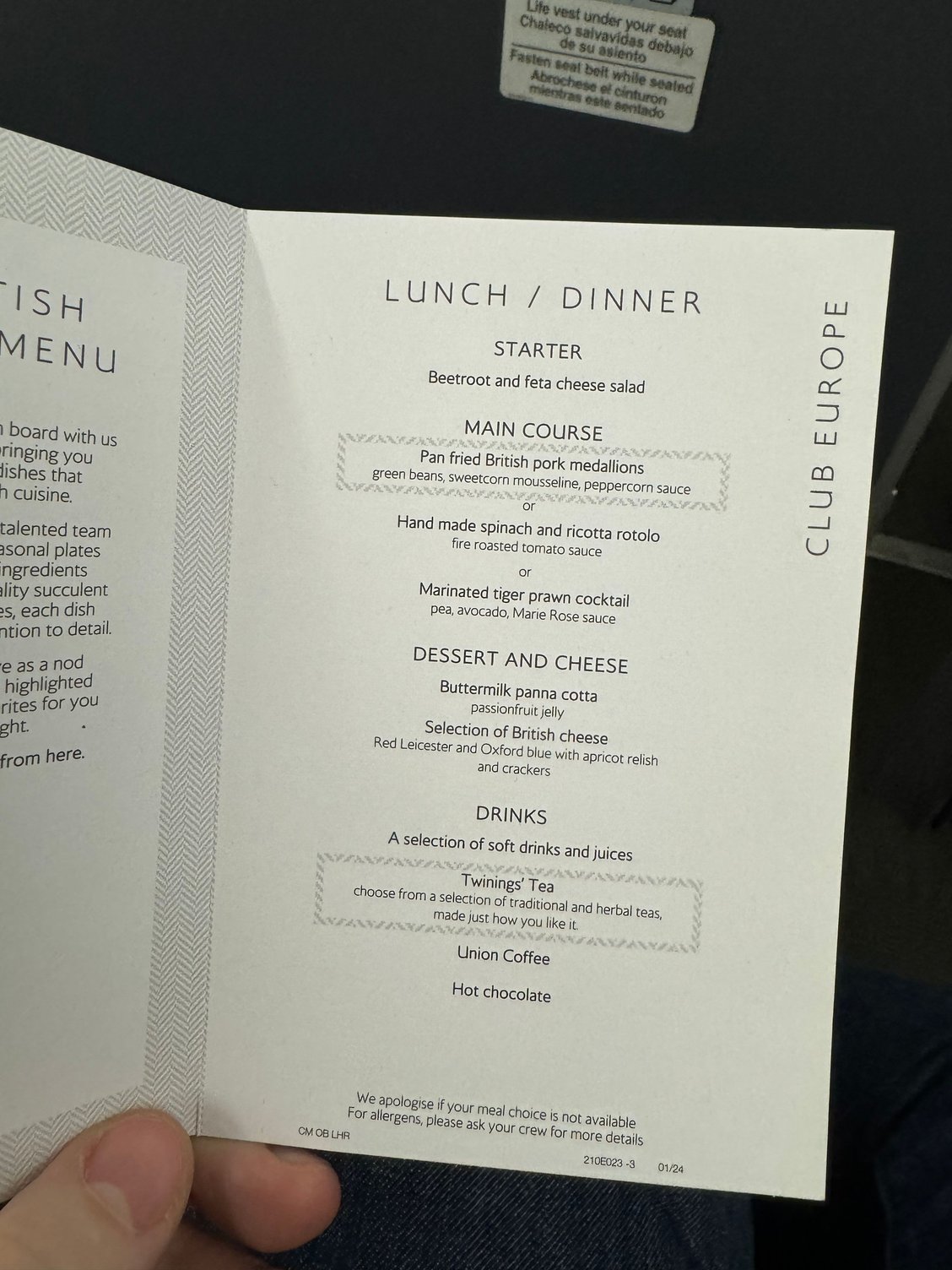 Meal choices were between pork medallions, a spinach and ricotta pasta and a “prawn cocktail” salad.