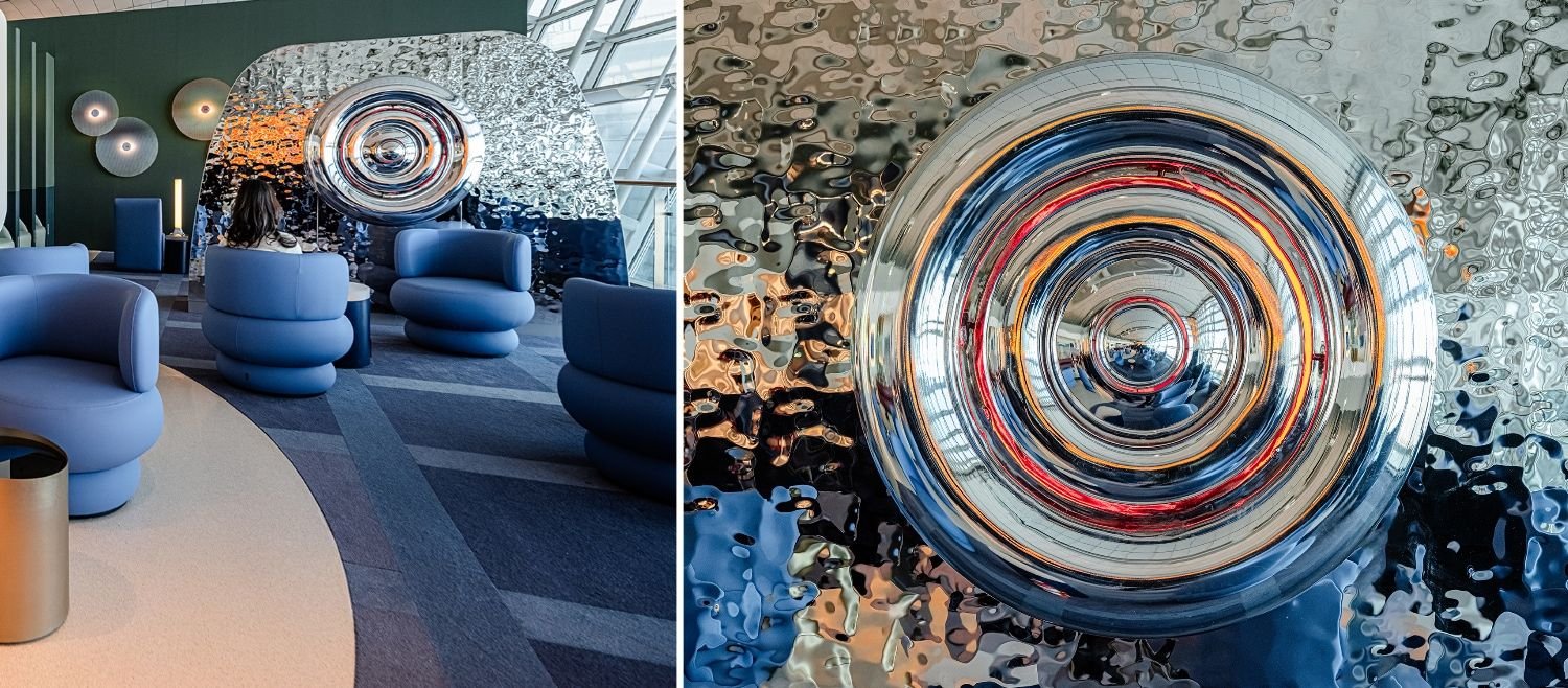 The metal feature above the bar in Seoul was intended as a nod to a specific South Korean hat called a 'gat', and the lounge designer said the bar was intended to always be not just a key part of each Oneworld lounge but also a very welcoming part, ideally right where travellers walk in past the reception desk.