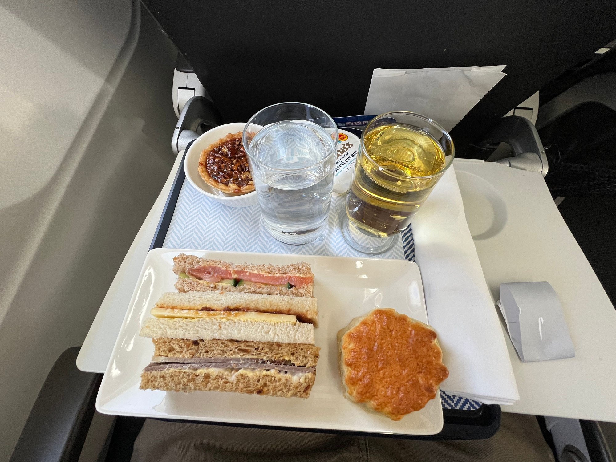BA 2558 - choice of meat or veggie based afternoon tea. Beef & horseradish, Smoked Salmon, Cheddar & pickle. Served with the fastest cake in the west - scone. The jam pot is behind the champagne which was served. Top ups happily provided. A320 and only about 10 pax, possibly fewer. Pecan pie/tart was lovely.