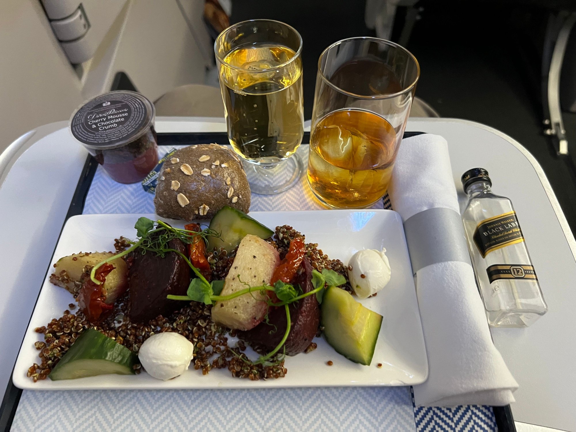 BA 2559 - no choice by row 6 on a 10 row club cabin. Quinoa salad based on some sort of cream/cheese with a couple of mozzarella balls, beetroot and what I thought might have been potato, but alas was not. Didn’t try the desert pot as I was avoiding the sugar high ;-). Bread was warm, asked for two drinks at once as I wasn’t sure how long they’d take. 3 working the club service but only one hand delivering trays. Wasn’t sure what the other choice was eliminated. Found the salad to be rather bland in terms of flavour. Kicked myself for not remembering to order a KSML. No sooner was the tray delivered than the glasses were removed for plastic counterparts with 40 plus minutes still to go. I didn’t feel rushed and took my time and had actually only just finished when the 15 minute call came from the flight deck. Champagne again from full sized bottles. Crew refused bar service once the trays were delivered but were happy to top up from the large bottle of fizz.
