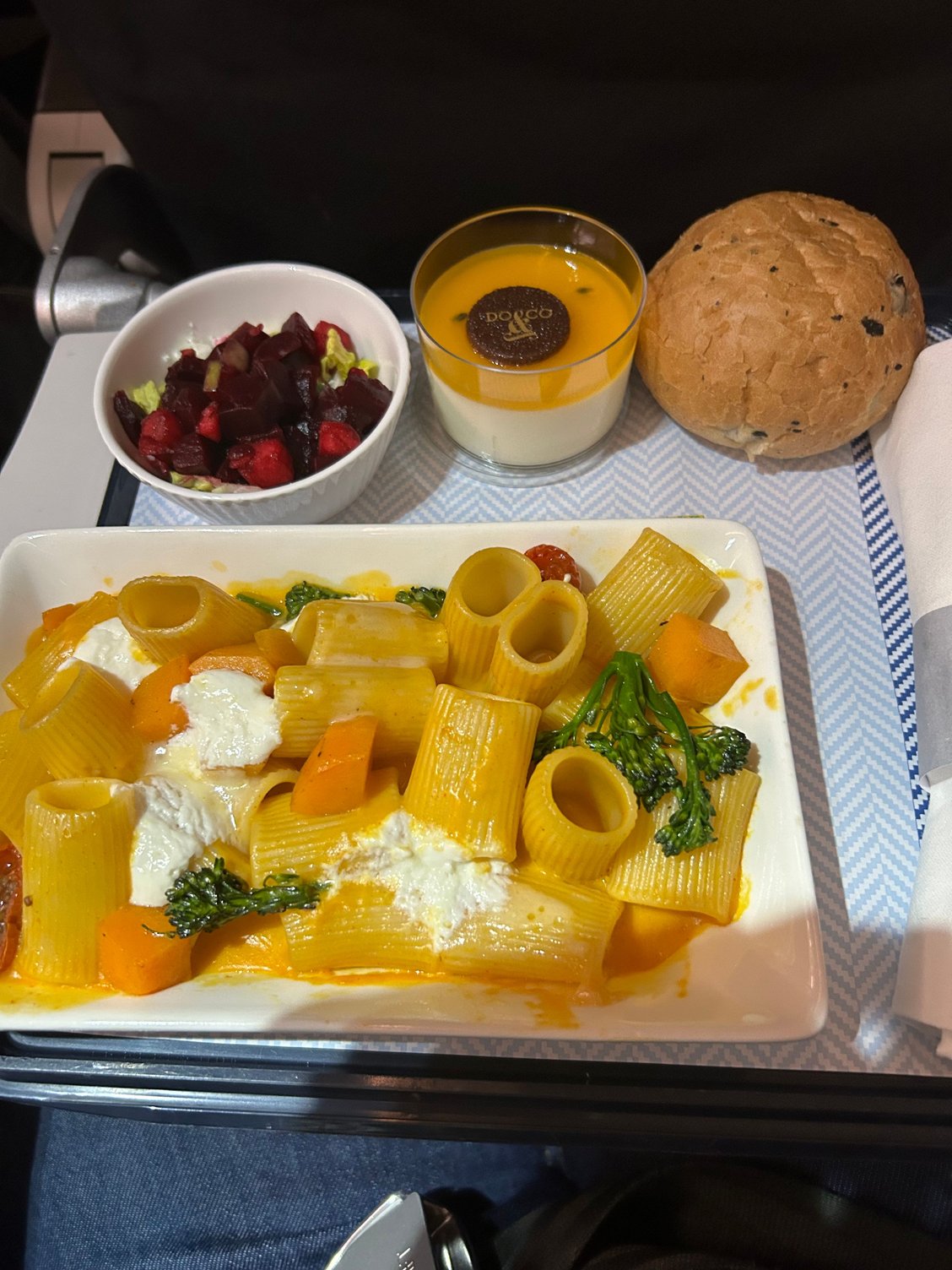 The pork had run out by row 2 as only 3 loaded so it was the choice of a butternut squash rigatoni or a curry. I went for the former. The beetroot starter was average but the pasta and passion fruit dessert were excellent. I thought the bread rolls weren’t as good as I remembered but it’s been a while since my last CE. All in all a great meal for a short flight with a decent crew.