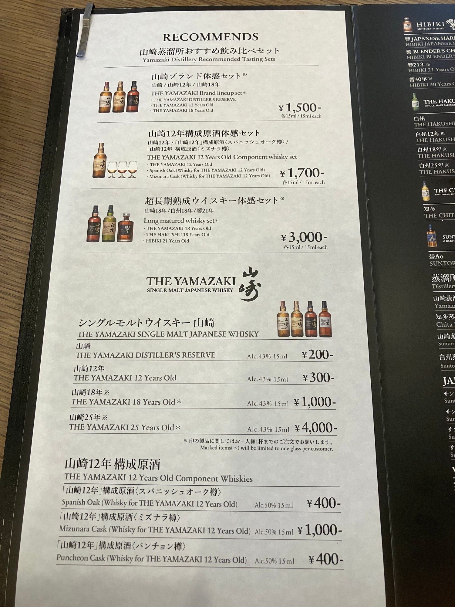 In the gift shop, the only Yamazaki they had was the 180ml, packed with either bacon or chocolate, for ¥3,000. No Hakushu/Hibiki of course.