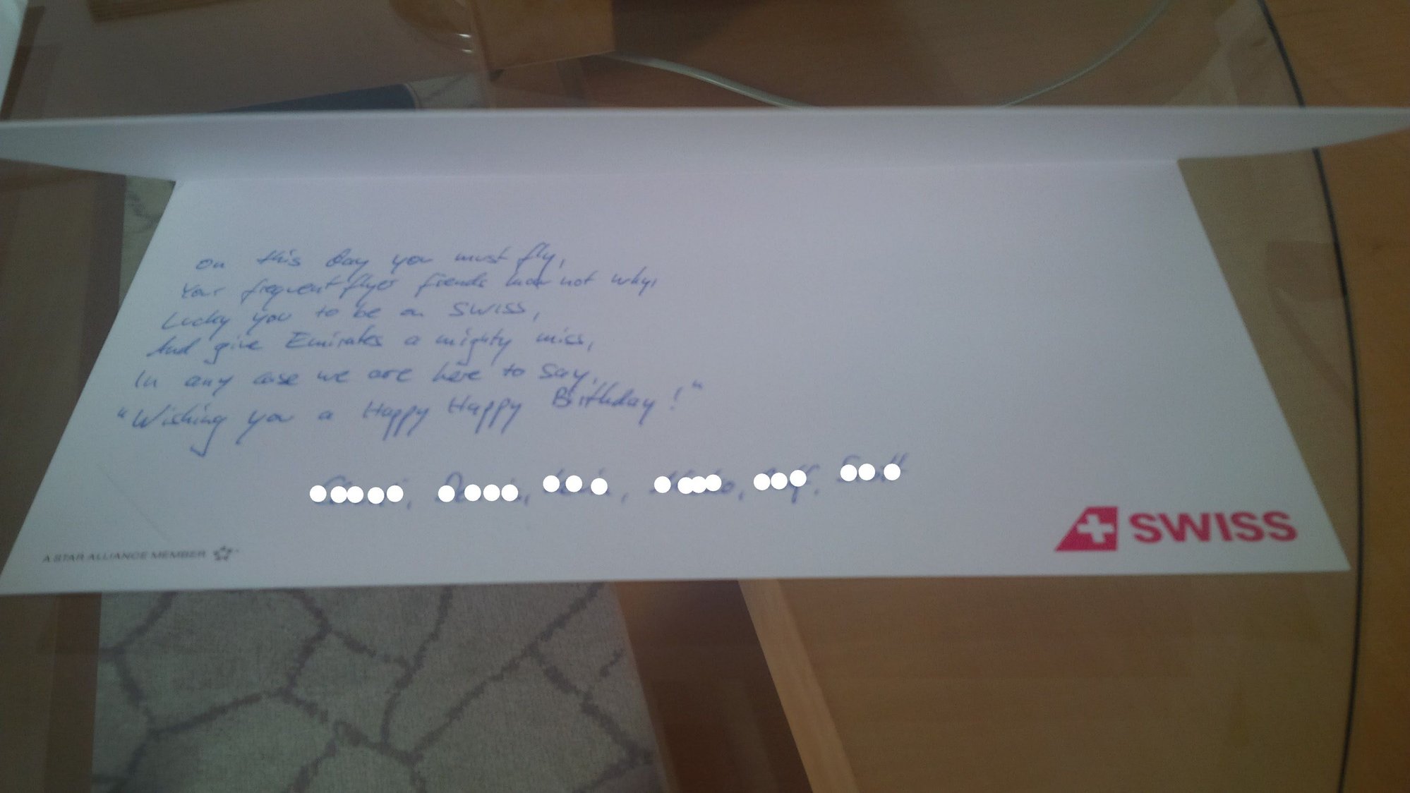 This was the day/night before my birthday... the next day as I boarded my FRA-MUC the purser showed up with a pdb at my seat and congratulated me for turning a year younger. Lots of looks from the surrounding pax. In flight nearly every FA showed up and shook my hand and the purser gave me a doggy bag with a selection of things she could find in the galley along with a bottle of the current bubbly. While deplaning the captain was standing at the door beside the purser and asked 'is this the birthday boy?' and shook my hand. 🫣🫢