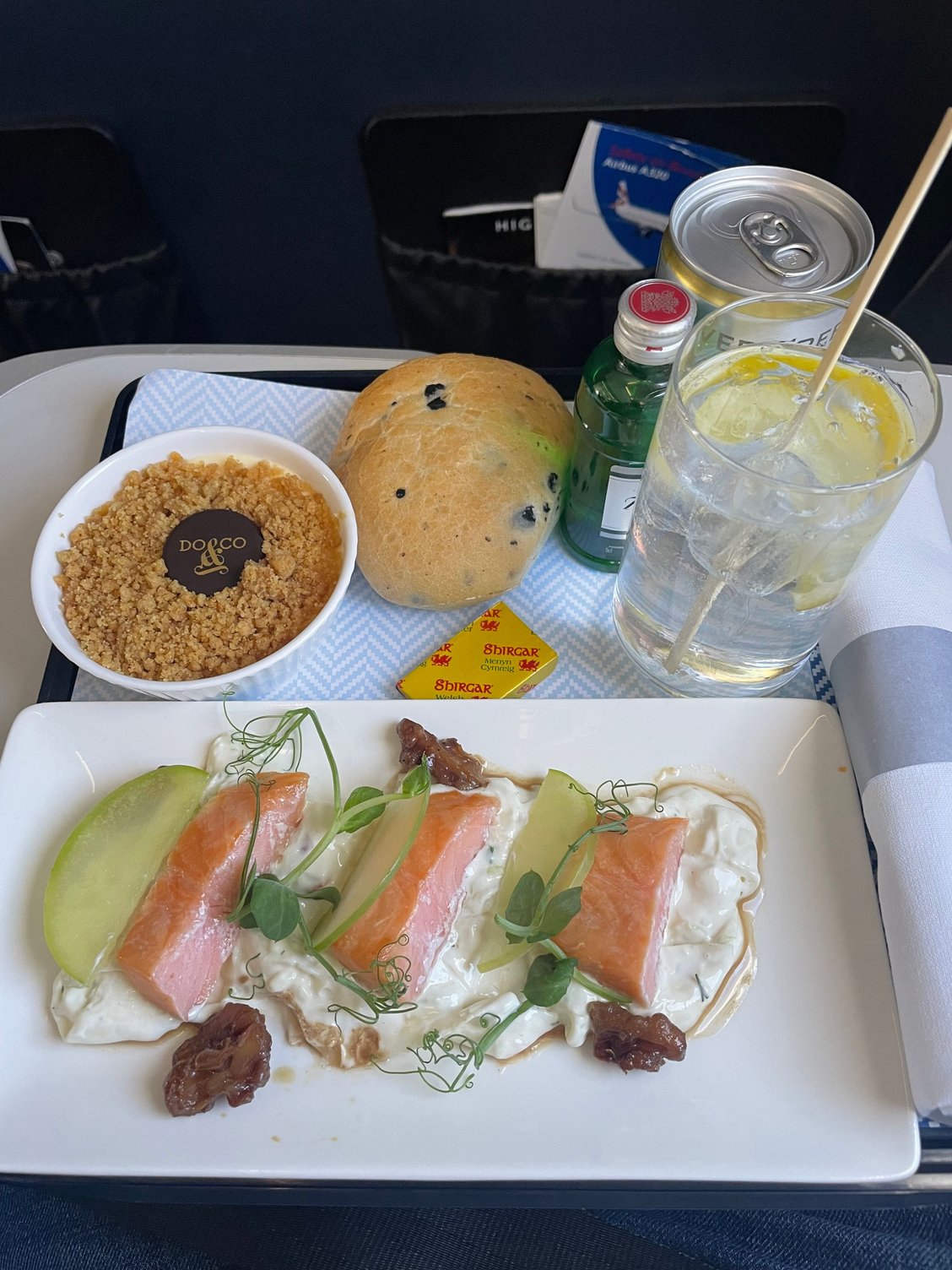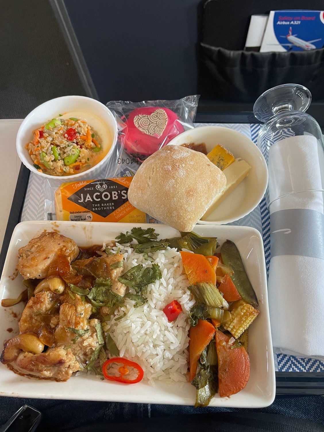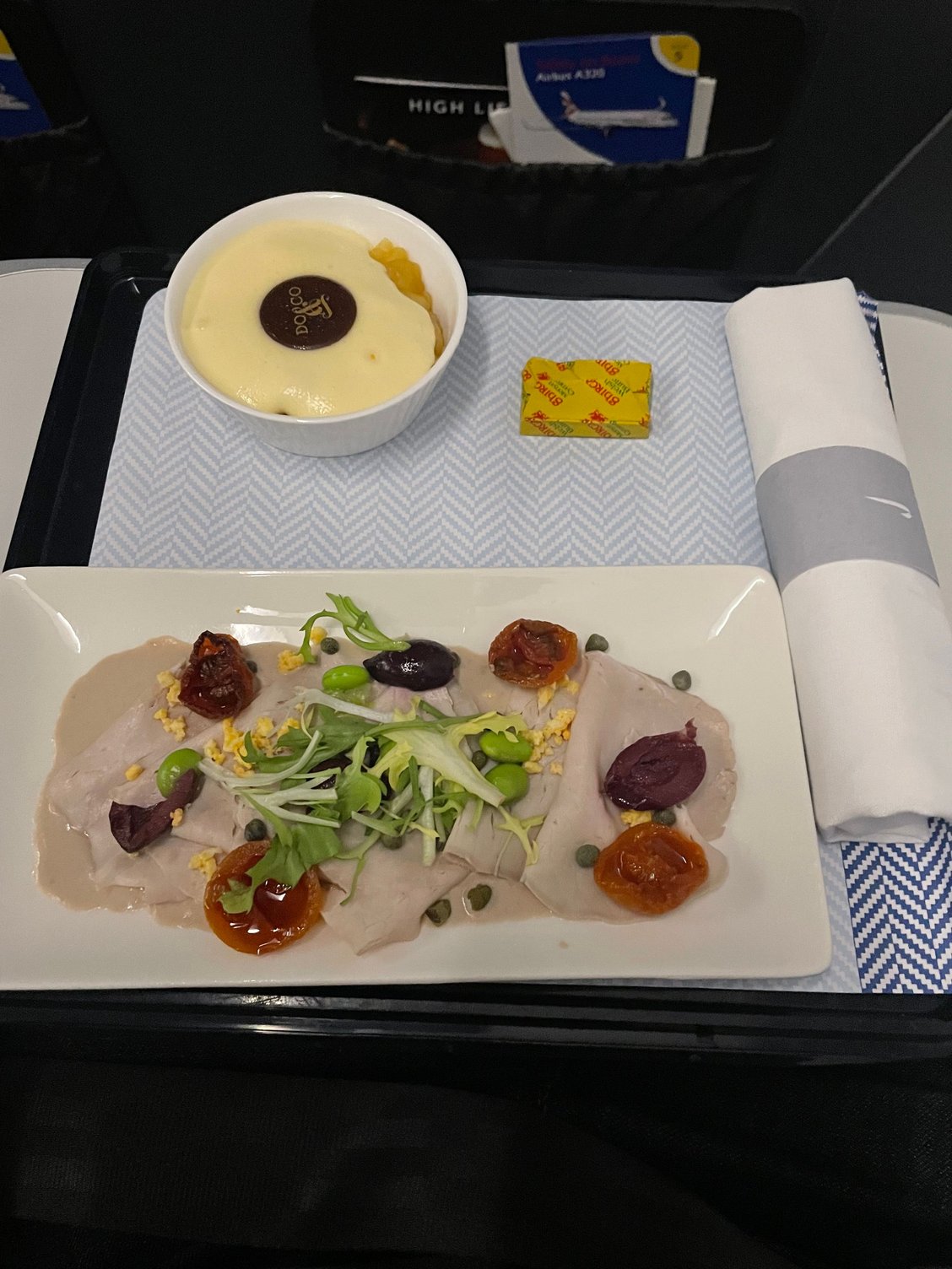 Finally, pork loin with tonnato sauce, FRA-LHR on 3/3. Bread was offered but I didn’t want one after a weekend carb-fest in Frankfurt. This time the crew described the meal as ‘turkey salad with cranberries’ - neither of which are actually on the plate 😂