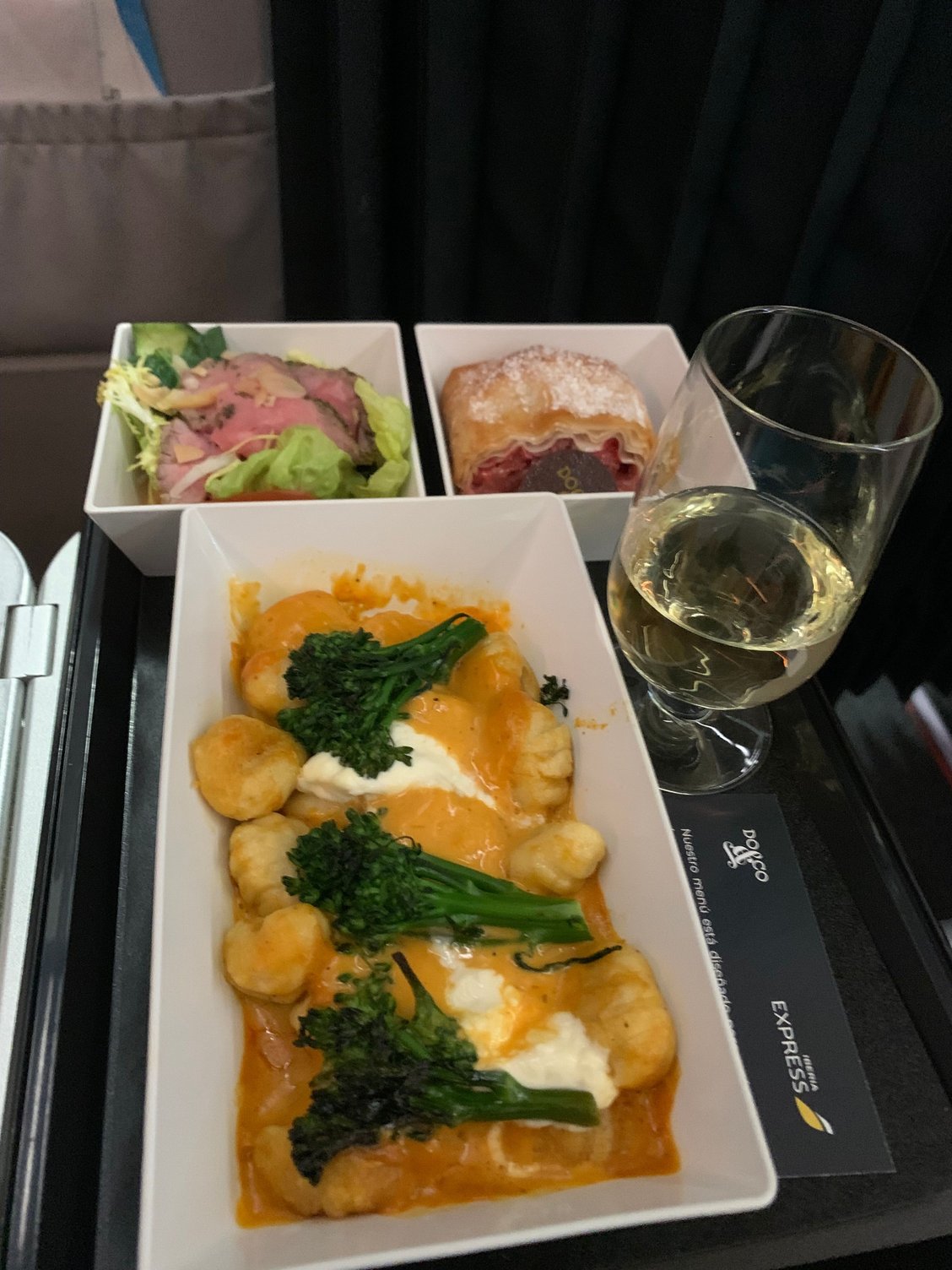 Before dinner, the bar cart came out. Meals followed about 19 minutes later. I enjoyed it all and found the Gnocchi very filling. There was a rare beef salad to start and what I would describe as a Strudel for dessert. Drinks were replenished upon request by a pleasant and friendly crew.