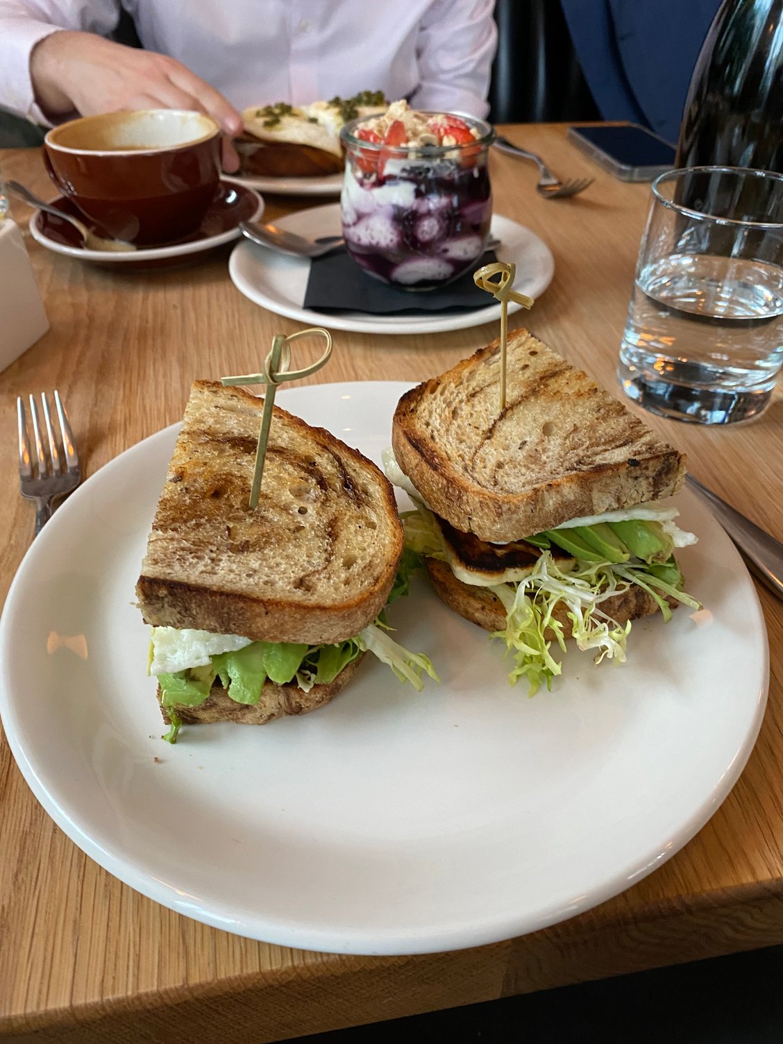 Grilled halloumi avocado egg sandwich, yogurt parfait