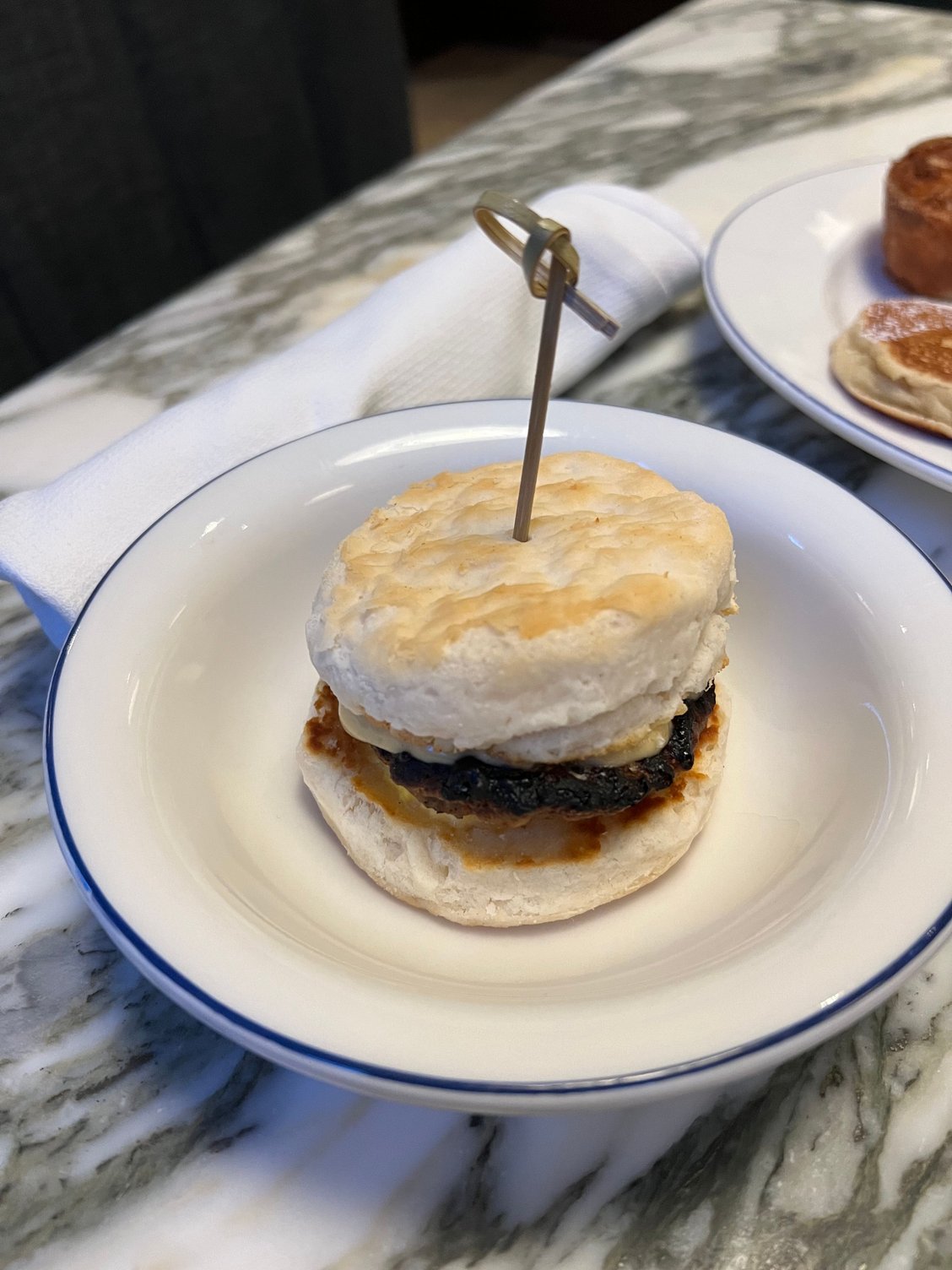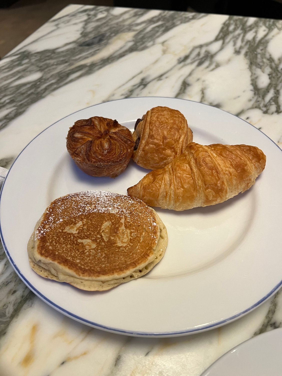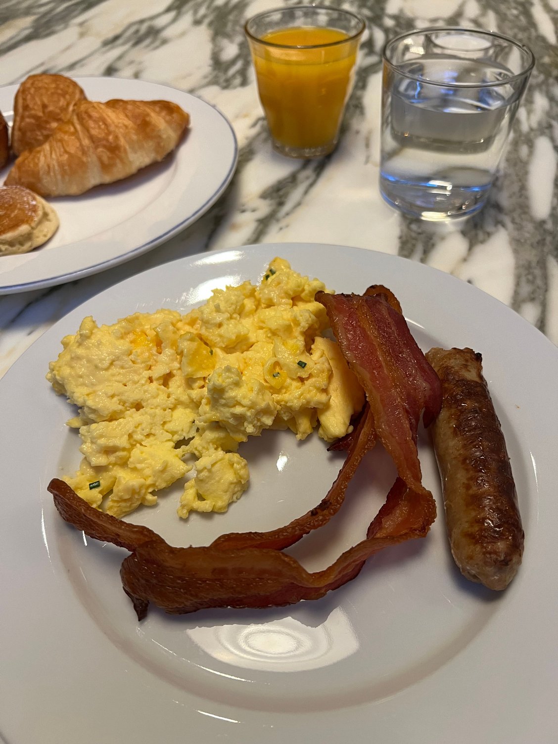 - Breakfast - told I could eat in lounge or restaurant (same food) - was great - tasty bacon, sausage, eggs, Kouign Amman, croissants, pancakes, etc.