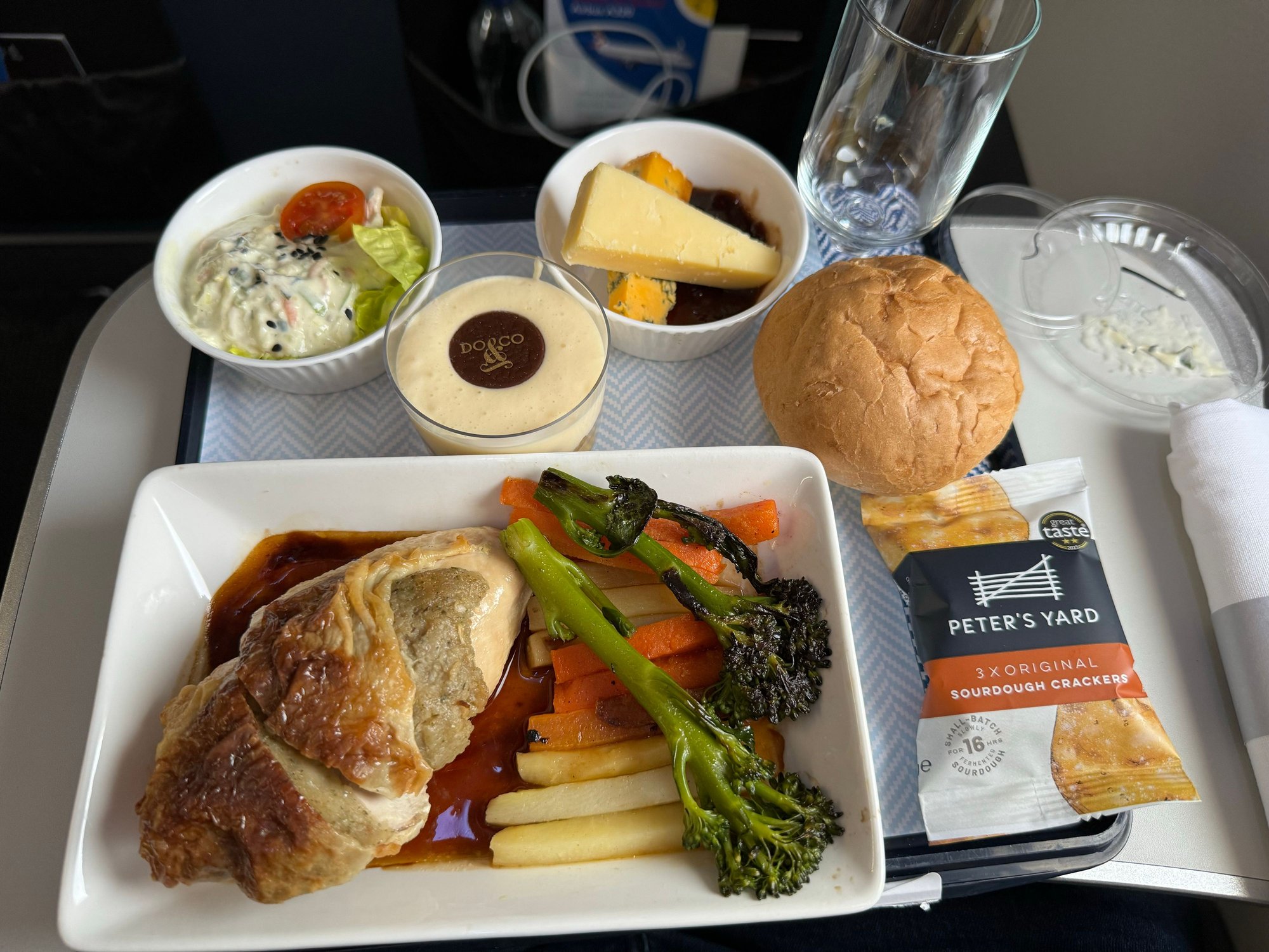 On the way back from Bucharest at the moment, no menus today but the choices were the stuffed roast chicken, chickpea curry or pork loin salad, so I went with the chicken which was moist with plenty of gravy/sauce and the veg still had some bite to it, really enjoyed it. The starter was a mustardy coleslaw with some lettuce and tomato garnish, dessert was a stewed apple topped with a mousse which wasn’t too sweet and actually went well with the Do & Co chocolate disc, the cheese was medium cheddar and I think Blacksticks Blue with a blob of pickle underneath. Overall a very enjoyable dinner washed down with some G&T.