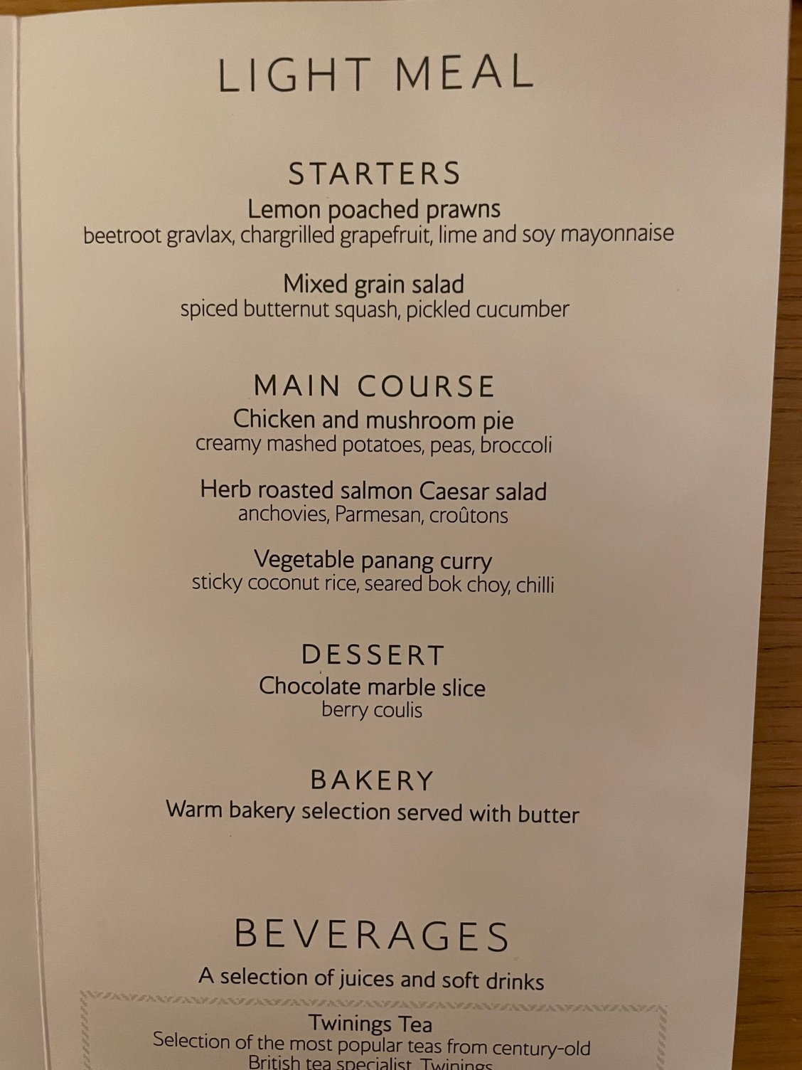 For completeness, here’s the outbound. We didn’t take it, but the menu was left tucked in the side of the seat when we boarded BA2202.