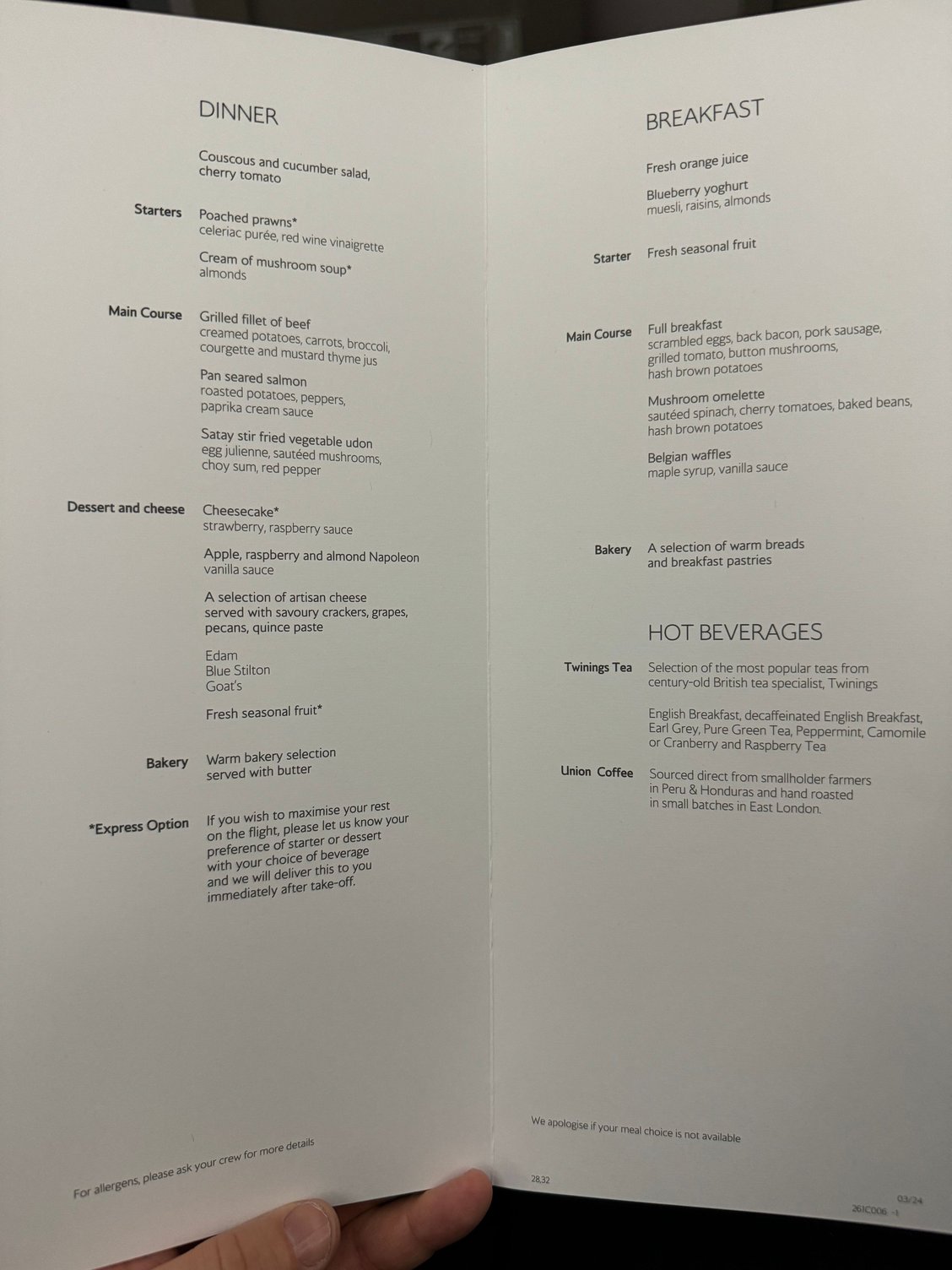 so please see the menu for HKG-LHR BA32 27/03/2024