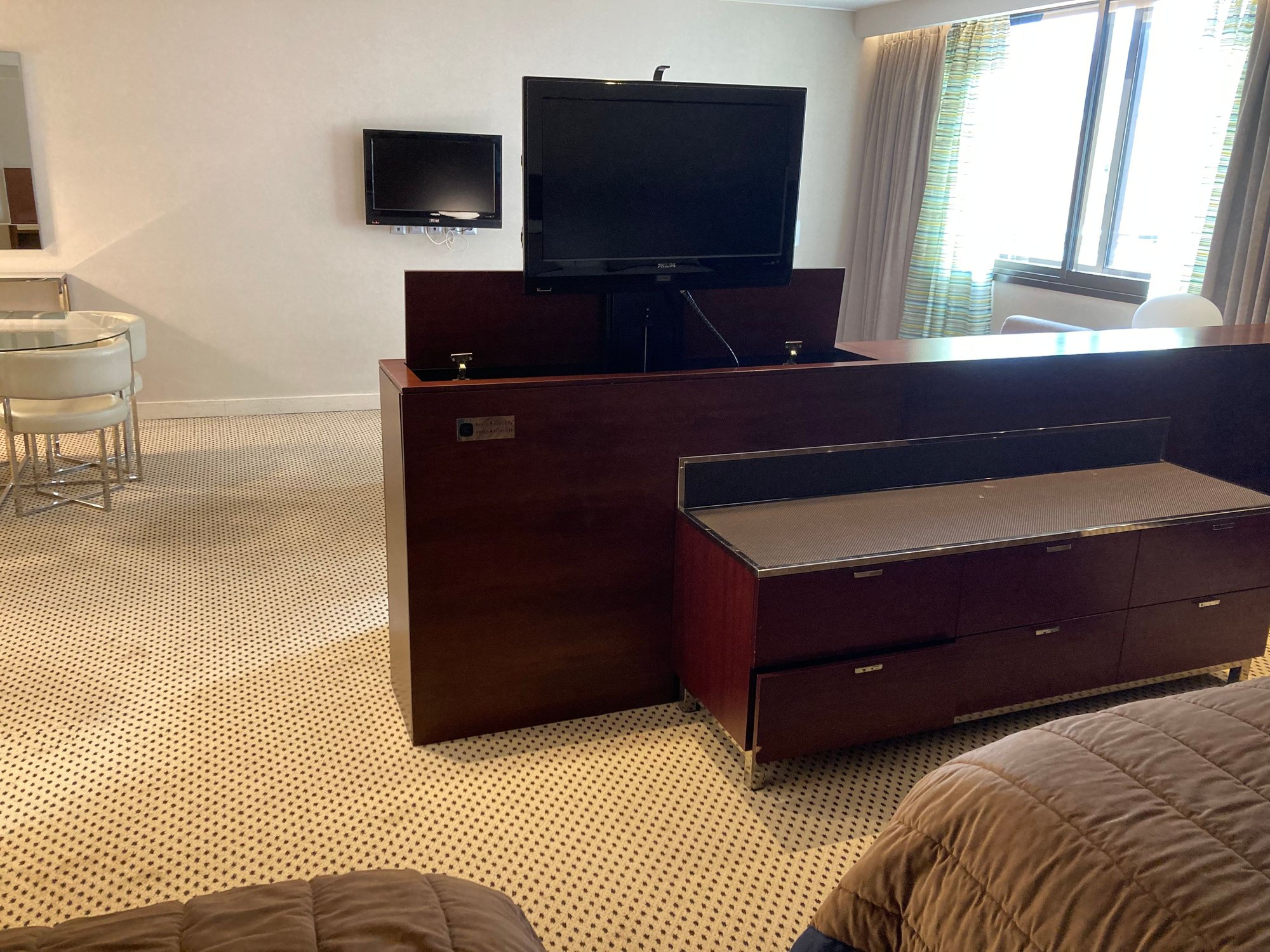 Don't worry there is a second larger TV secreted in the cabinet in the sleeping area