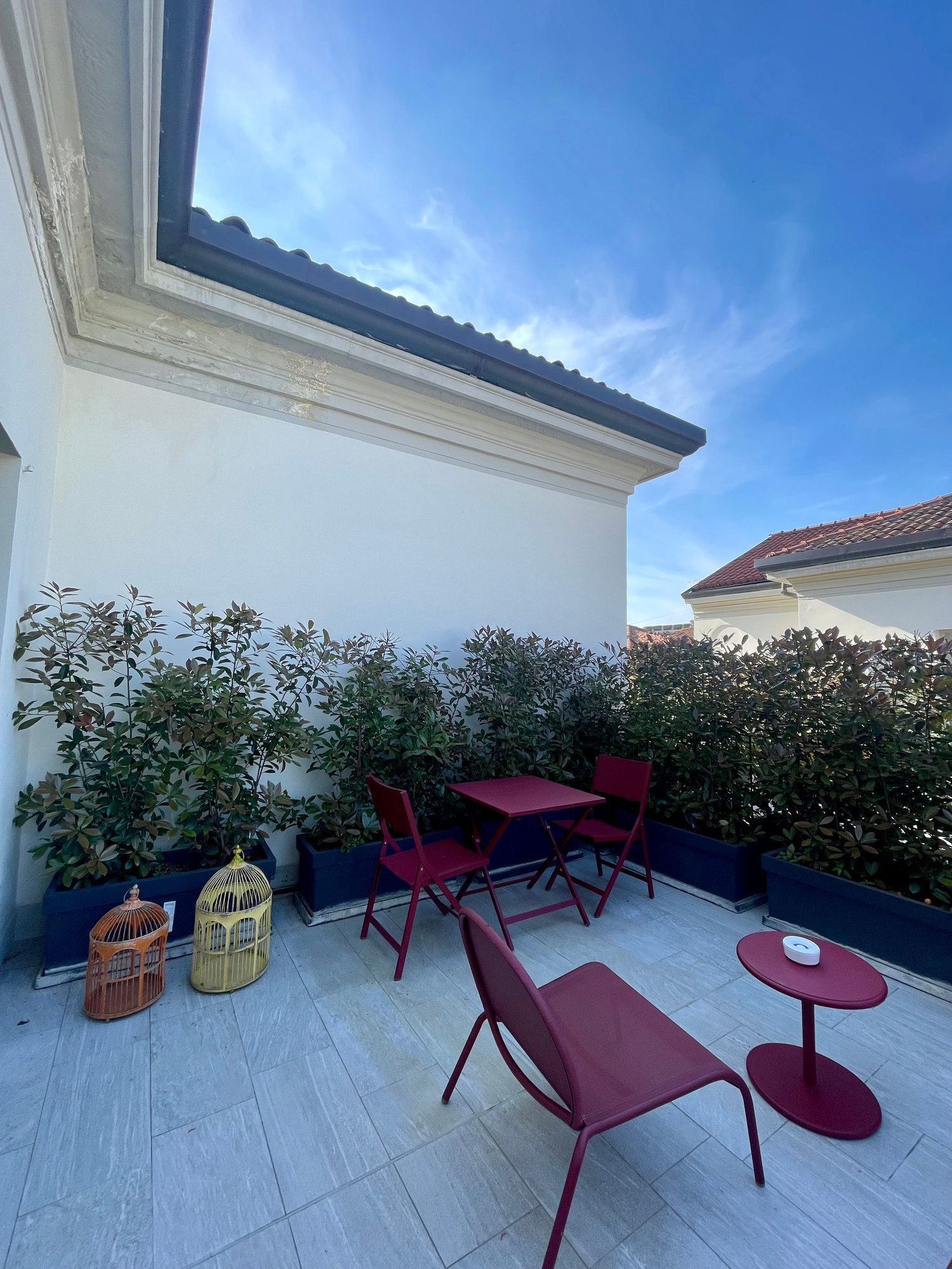 Lovely leafy private terrace with table, chair and lounge chair.