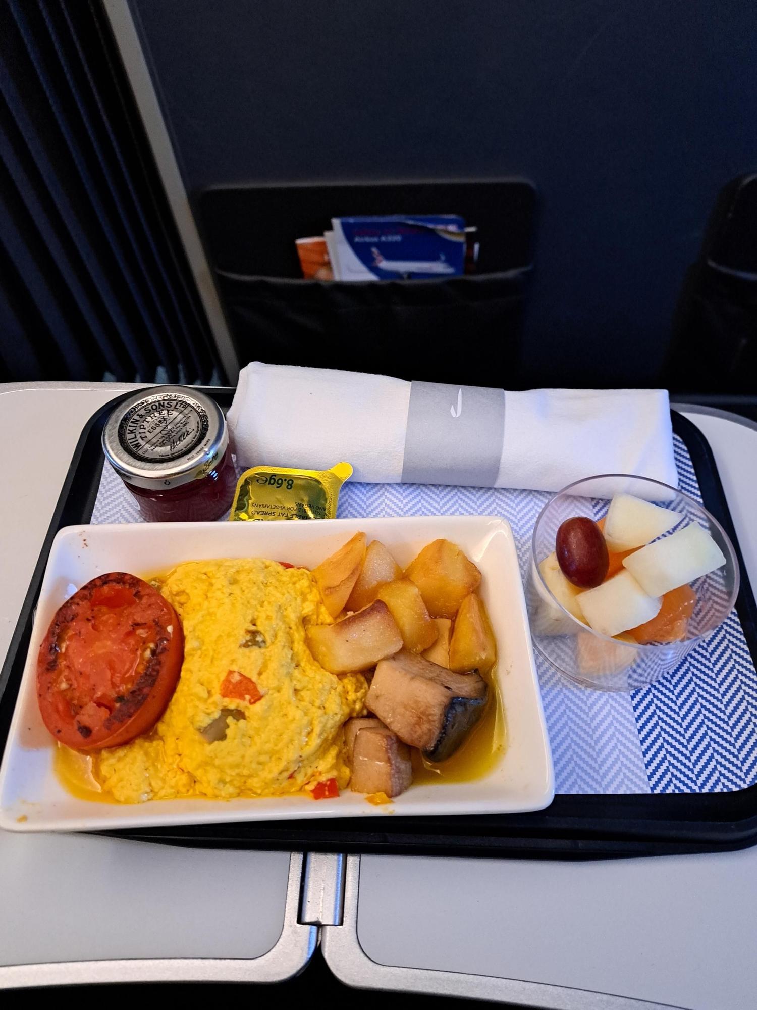 NCL-LHR 6 April BA 1321 06:05 departure. No menus handed out. Good crew. VGML breakfast - really nice. Gluten free bread roll also on tray, which I did not want. Other choices were full British or omelette. Husband had full British, which he enjoyed. Sausage was small, similar in size to post #685!