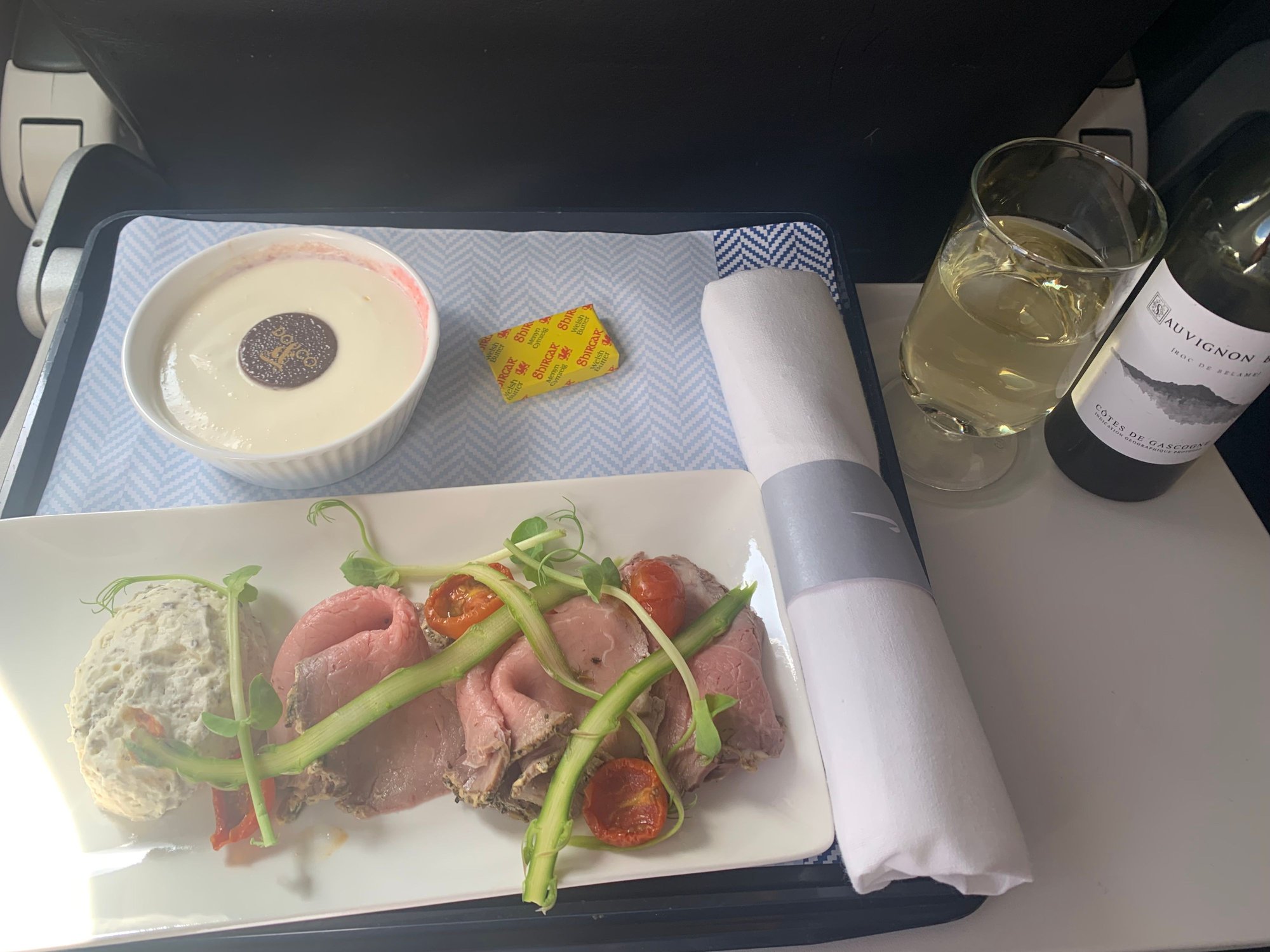 Seven rows of Club Europe on the 11.55am Aberdeen to Heathrow service earlier today (1307), four seats empty. No menus provided but choices were a beef salad or a carrot salad (had been hoping I might see some salmon). Not sure what the dessert is but had some sort of creamy top and a fruityish bottom in a particularly violent shade of orange. Headed to T3 (Cathay lounge continues to be terrific) so declined the bread. Refills offered twice on the short hop; good effort.
