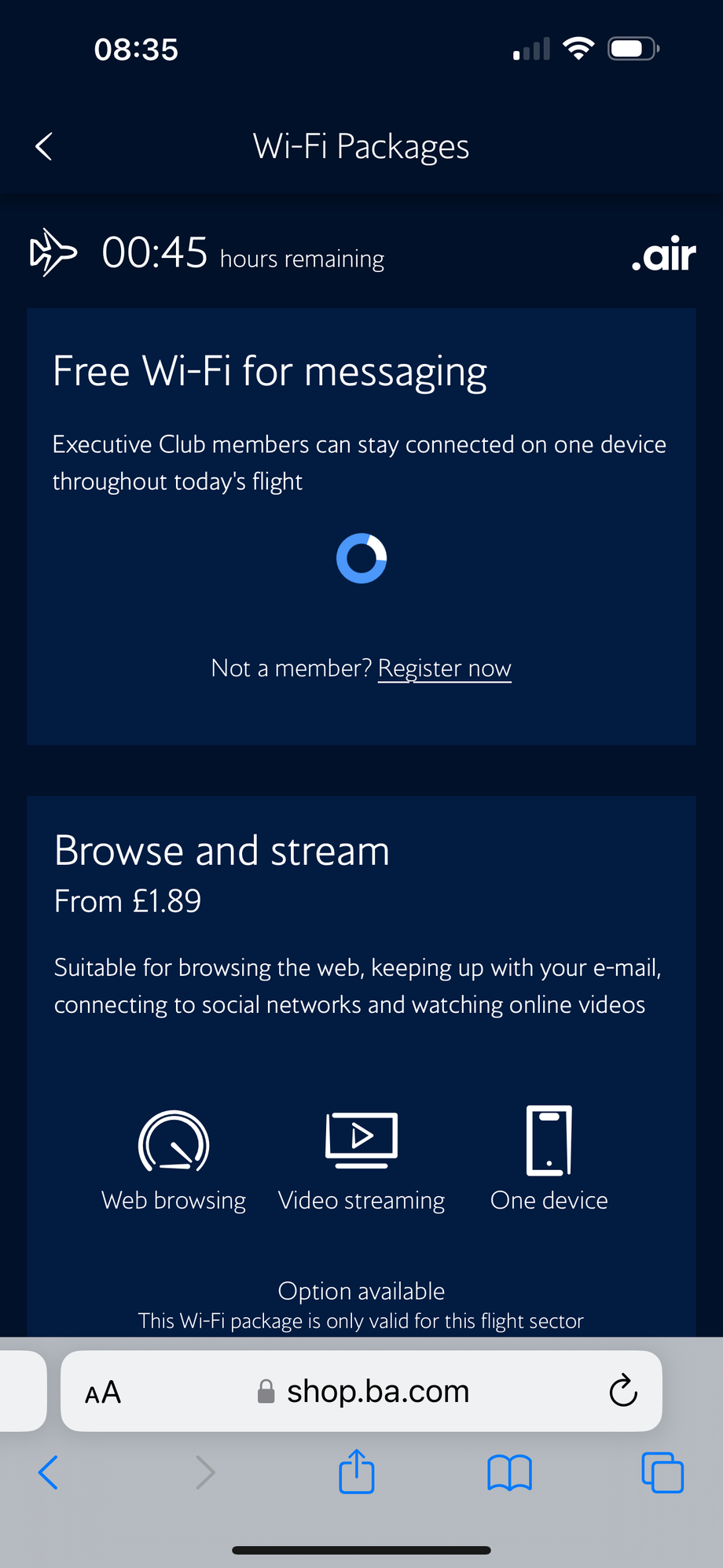 We were off the ground at half past the hour and as part of the In Flight leads announcement she reminded everyone that BA are now offering free wi-fi for messaging on all flights and so I thought I’d give it a go. Unfortunately this failed at the first step, attempting to get a log in screen just resulted in the spinning wheel of doom.
