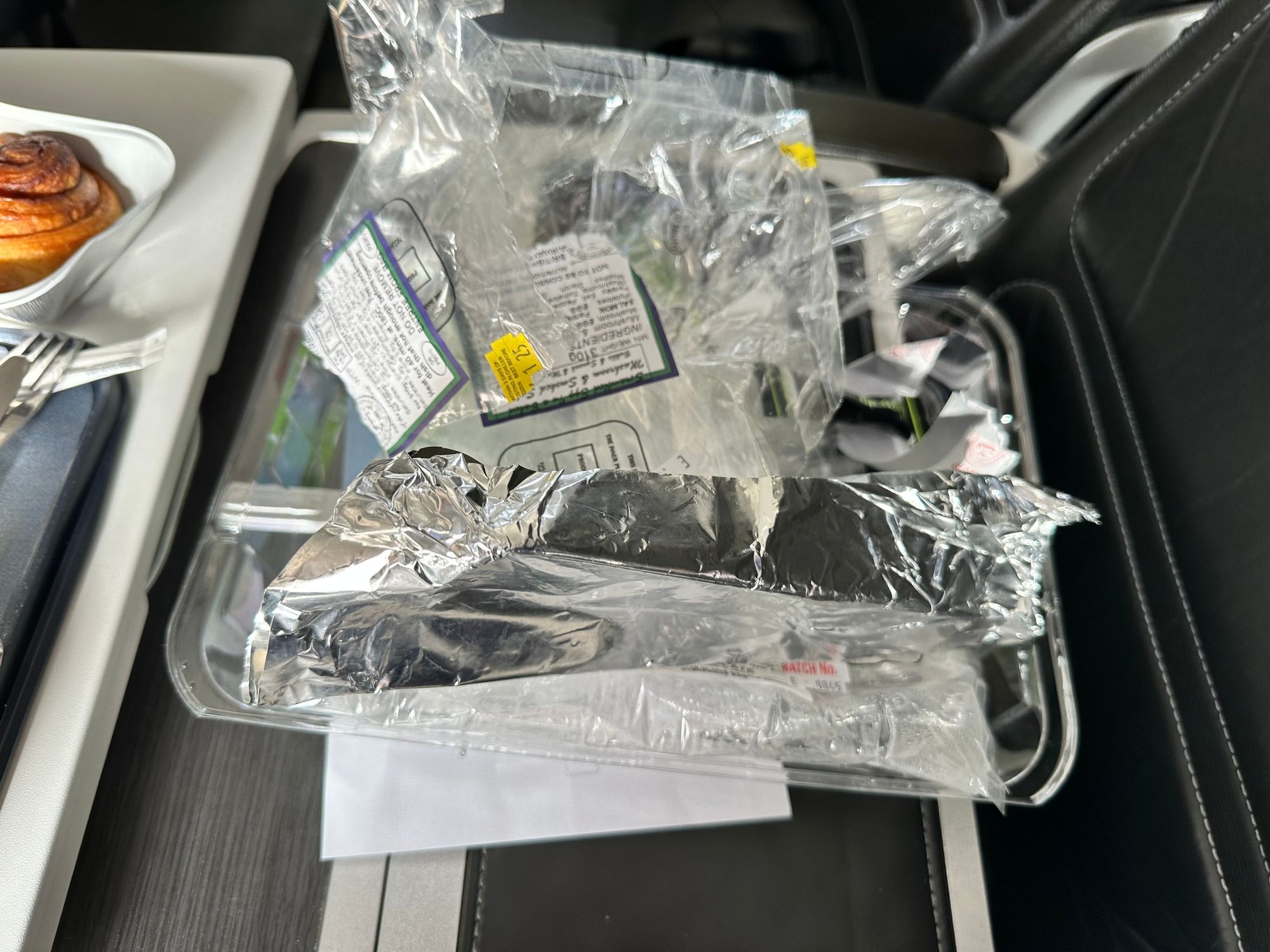 My Kosher meal arrived still all in the packaging so I had the joy of unpacking it and the hot tray in particular is fun to unwrap. There was an impressive pile of trash by the time I had finished. The meal itself was the worst Kosher one I’ve had, everything was sloppy and flavourless, apart from the bun which was as delightful as ever.