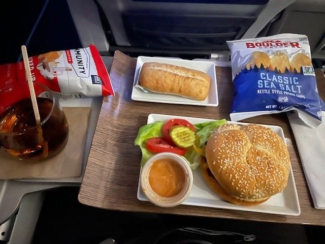 AS 143 SEA-ANC 4/22/2024 I have had the burger many times and really like it. It had been served with fruit in the past so I grabbed a bag of chips from the Admirals Club in DEN to go with it. Glad I did! I detest the new chips a lot!!!! Blueberry cheesecake served seperately after trays were cleared.