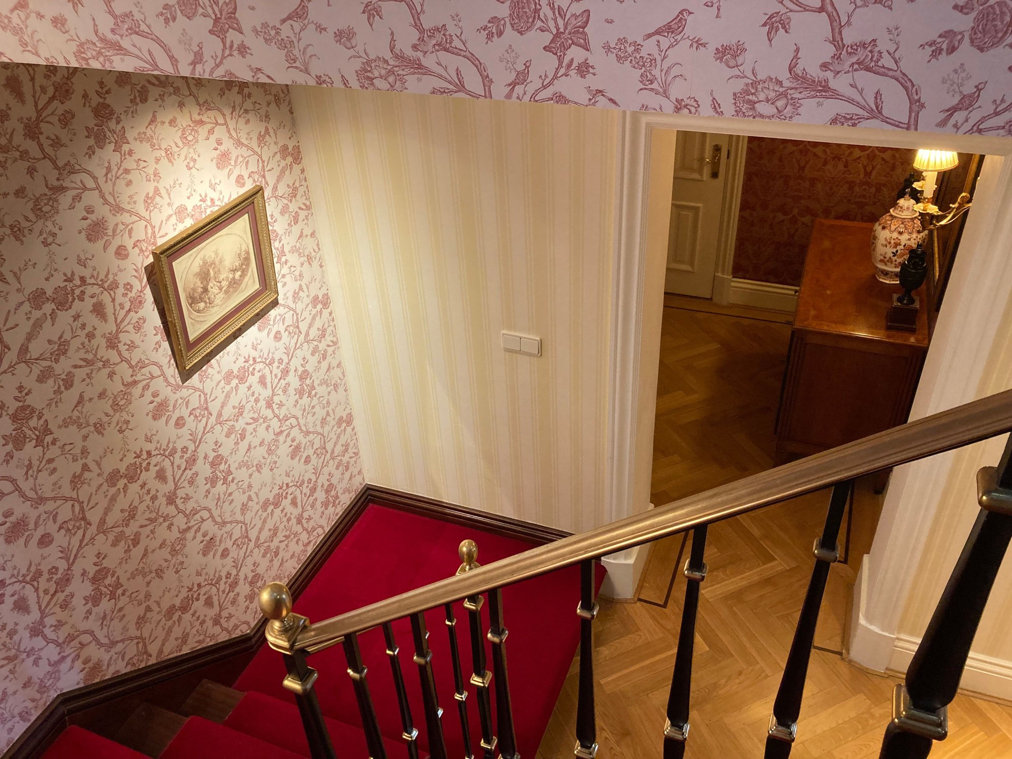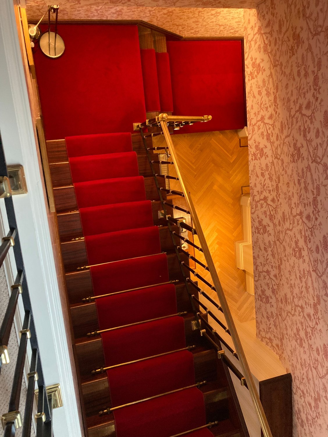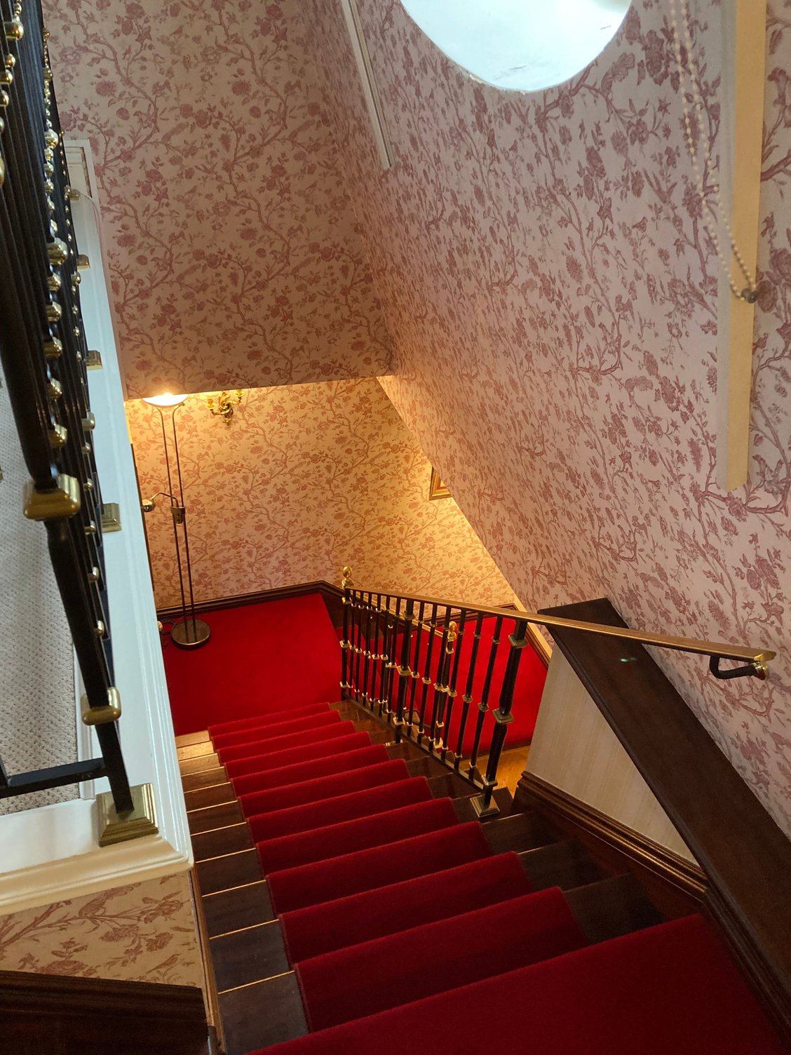 Standing on the red carpet staircase looking into the living room