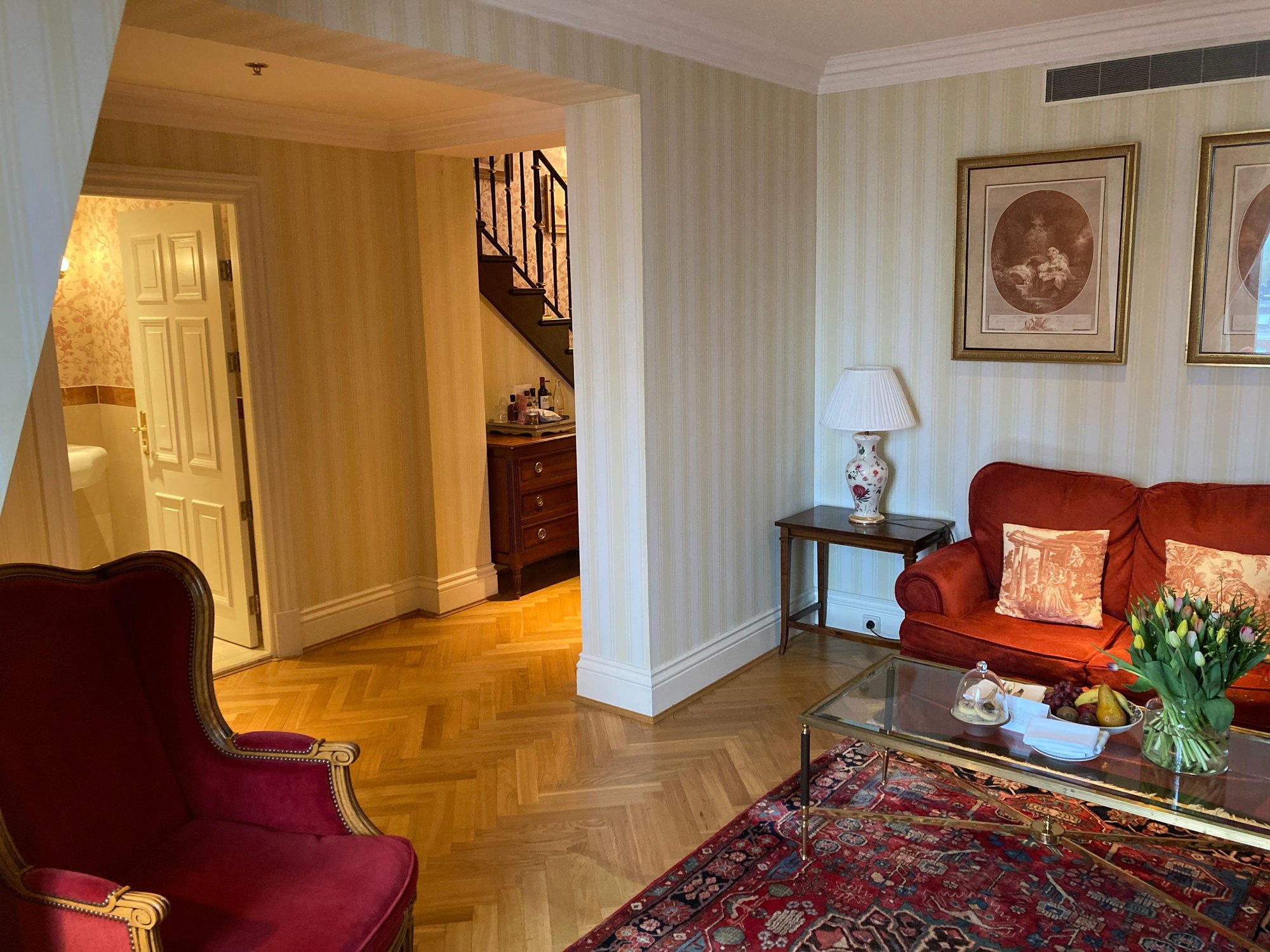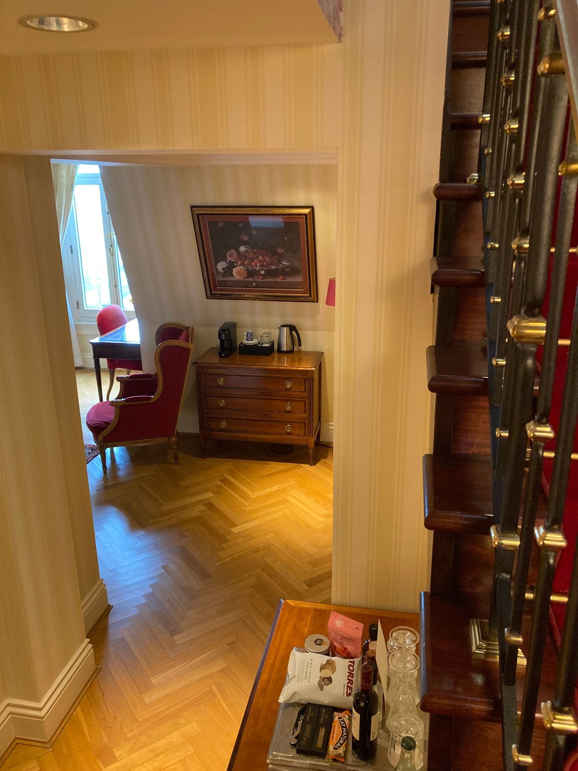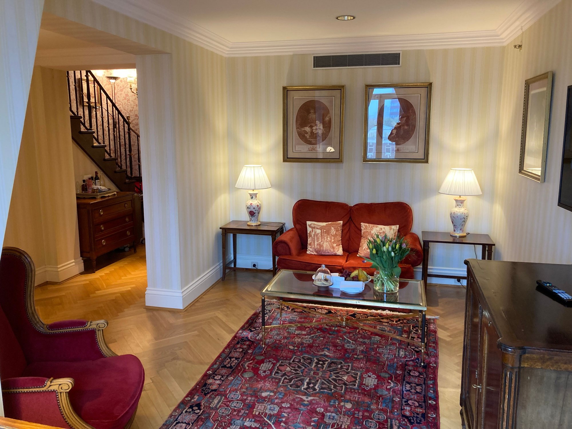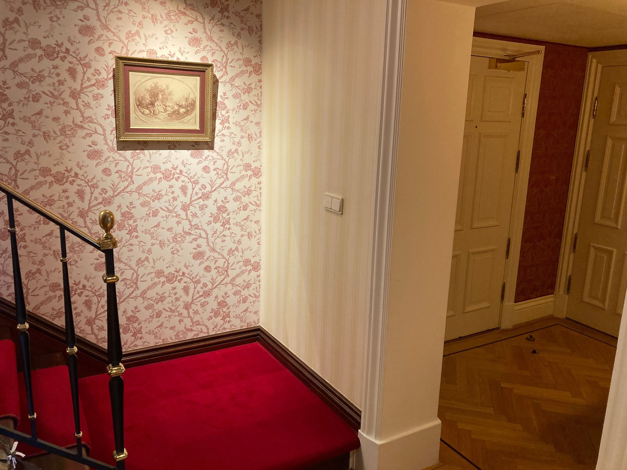 Standing on the red carpet staircase looking into the living room