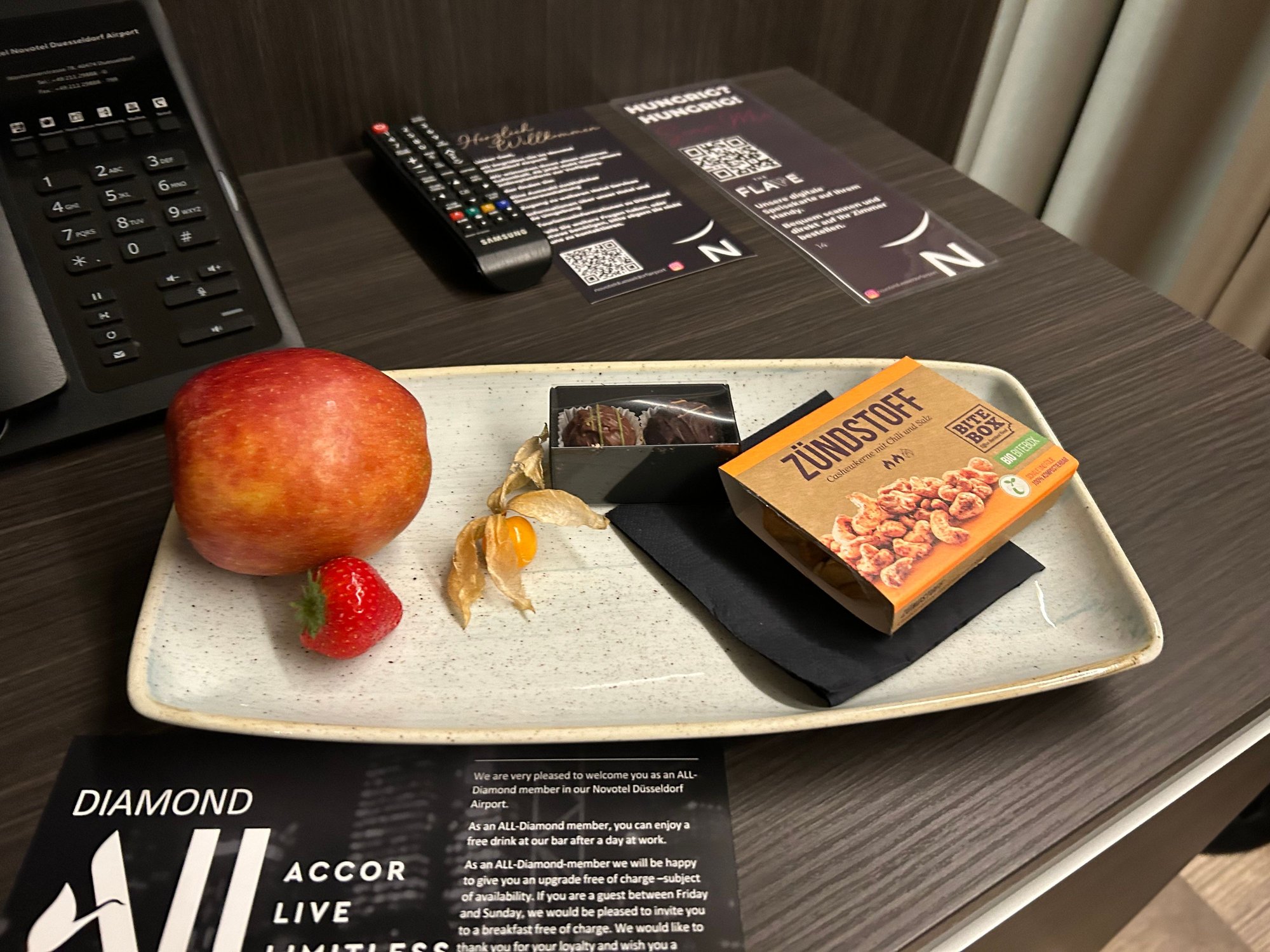 Drink voucher was given spontaneously but I had no time to use it. Free Diamond breakfast was granted without problem. Welcome amenity was placed in room prior to arrival : the famous apple but also chocolate sweets and a pack of salted crackers. Not bad at all for a Novotel.