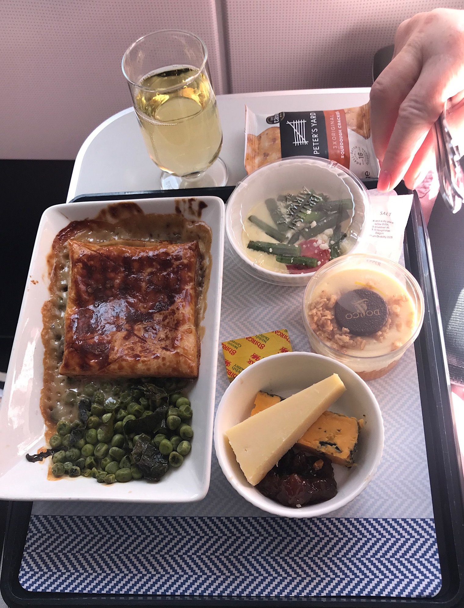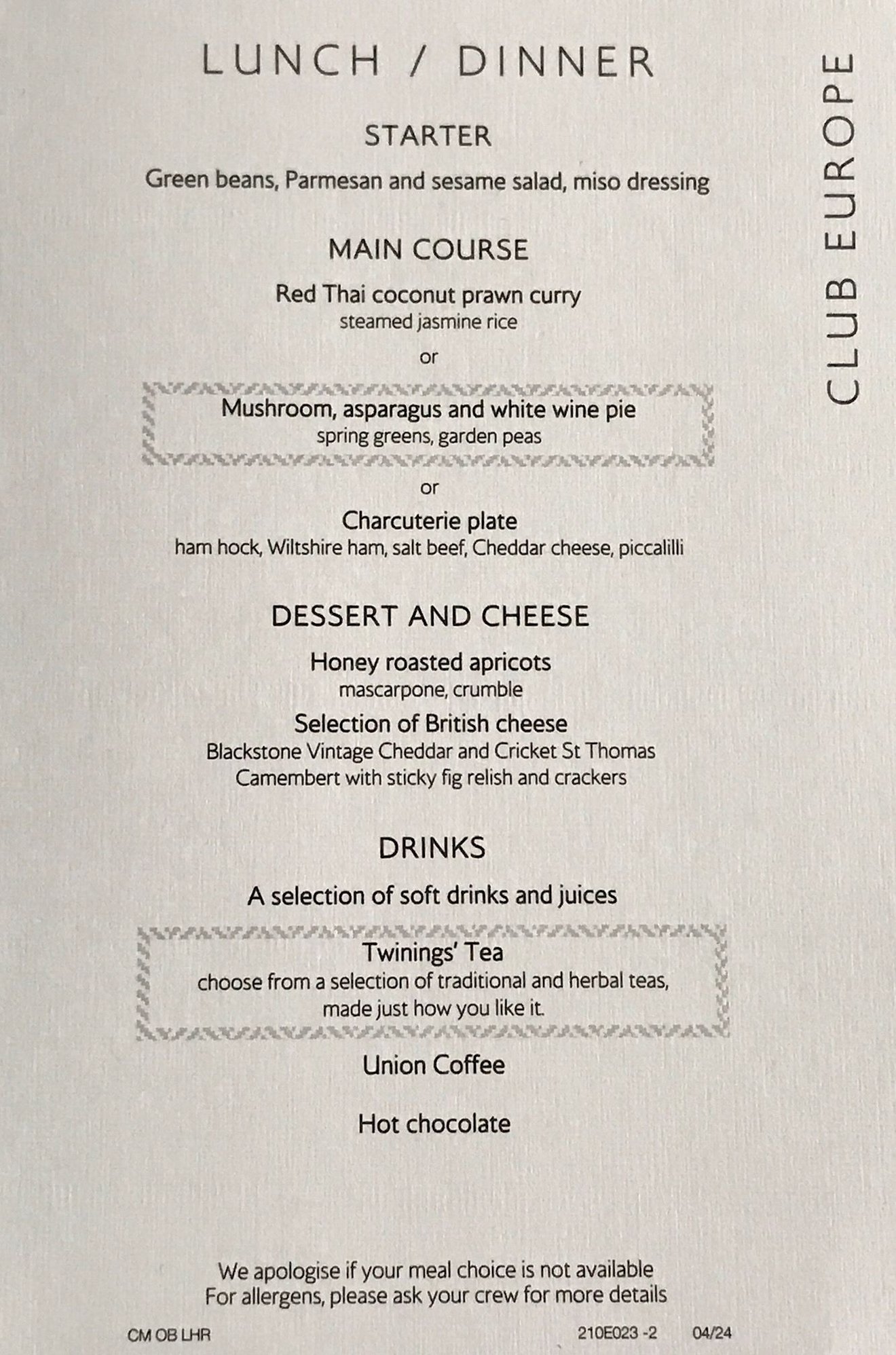 Total of 3 prawns (!), enough spice to make it tasty without being too hot. Why can’t they remove the tails? Would make it easier given it’s served on a small tray in a Club Europe cabin.