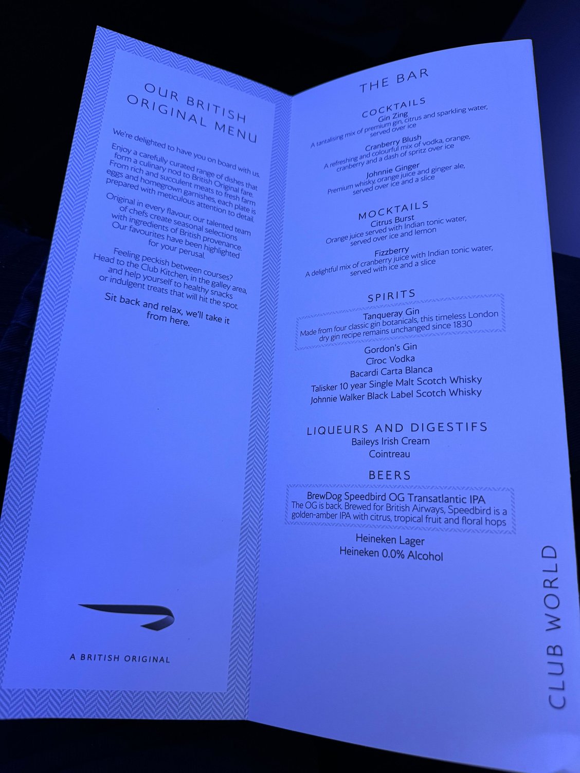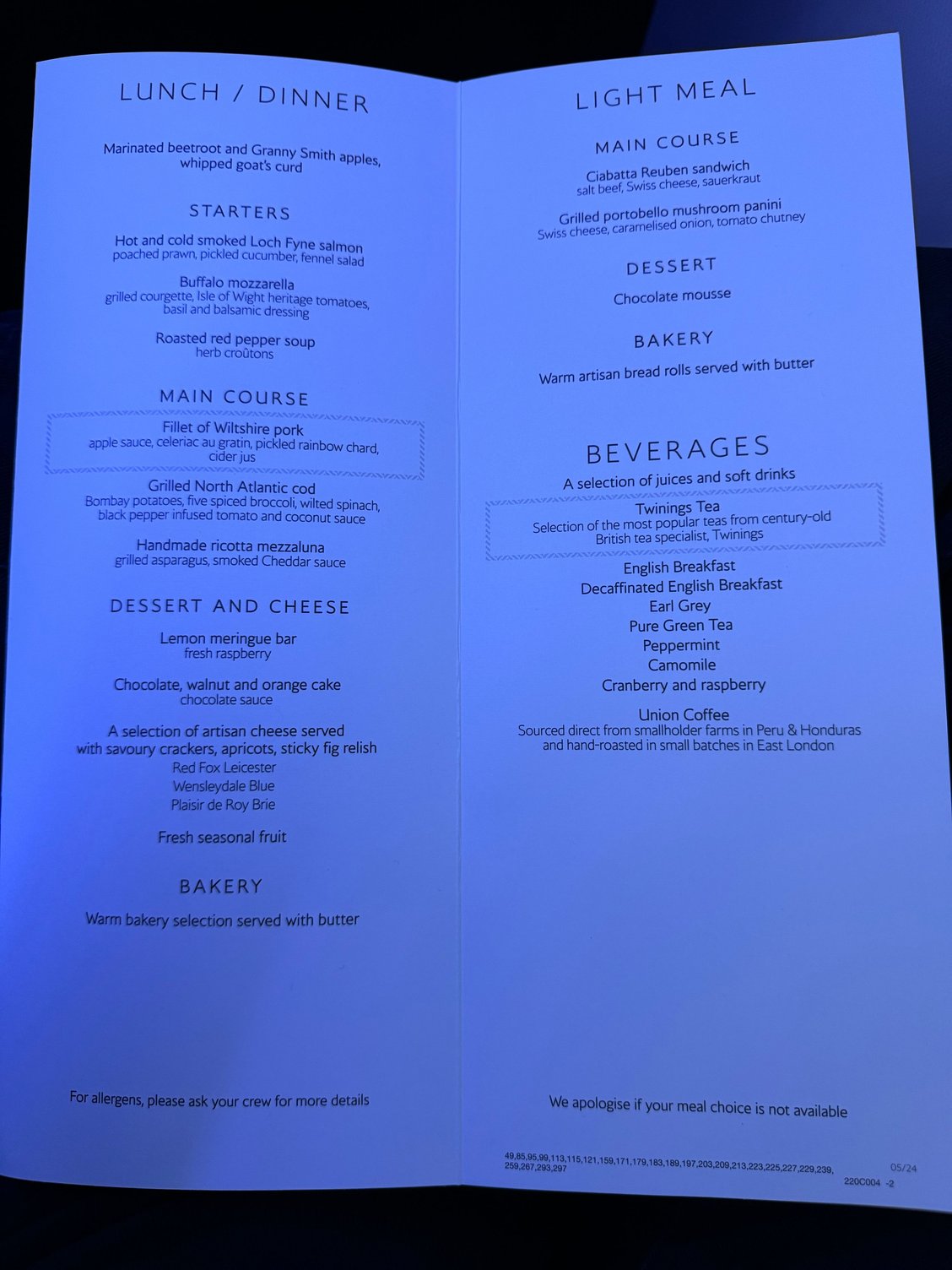 BA239 to Boston this evening. A slightly different light meal offering to the other flights across the Pond I’ve seen posted so far this month. No broccolini advertised with the pork main either!