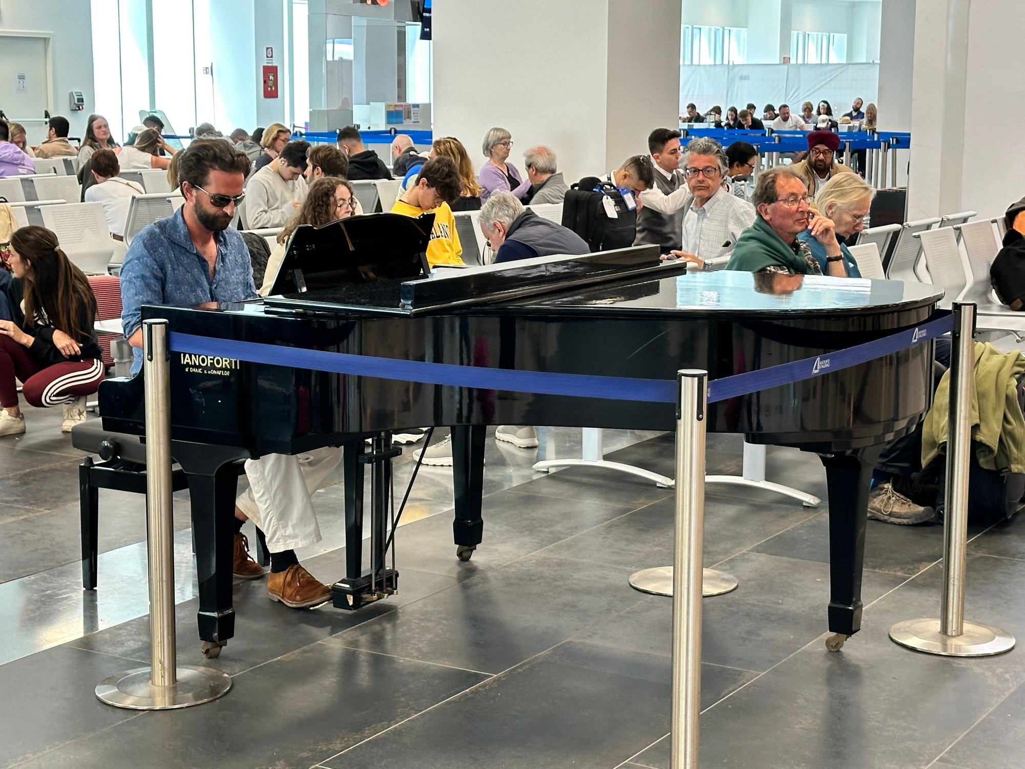 In front of me is gate A16 and this gent doing an excellent job on the piano