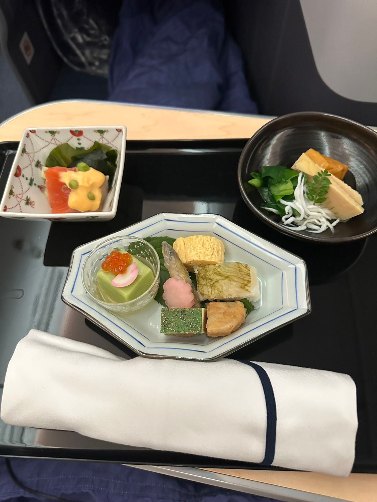 1) It was fine and wasn't too bad. Of course it's worse than first class. It was like barely better than their lounge food, which in my opinion is worse than Centurion Lounge.