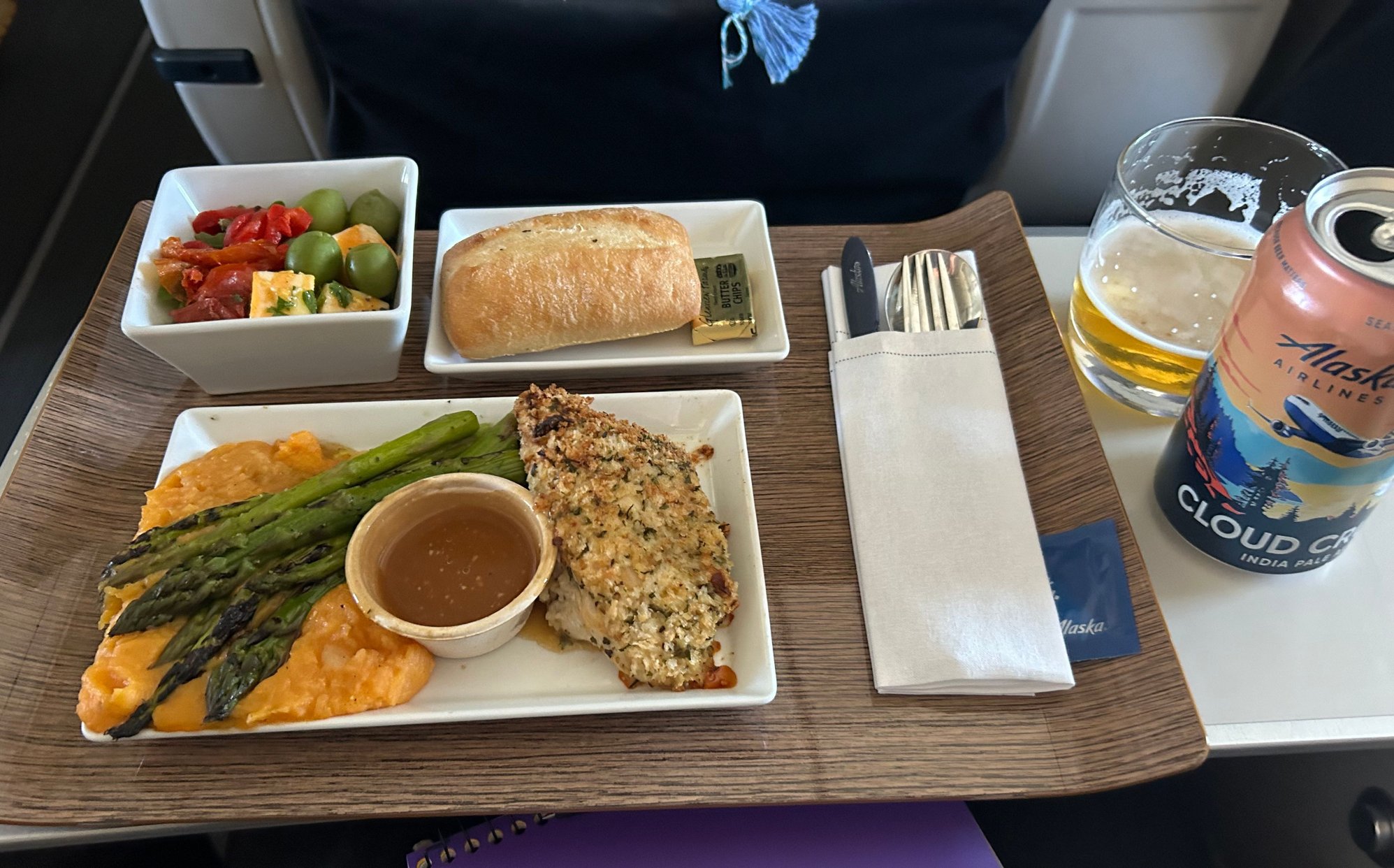 Parmesan crusted chicken, which I’ll be having again. I was surprised to get a real quantity of asparagus as opposed to the two or three spears I’ve seen before on other carriers. Not a huge fan of it being on top of the sweet potatoes, but that’s obviously a space constraint on the plates. Dessert was Salt and Straw ice cream served shortly after all trays were cleared. A couple of passes of the snack basket followed.
