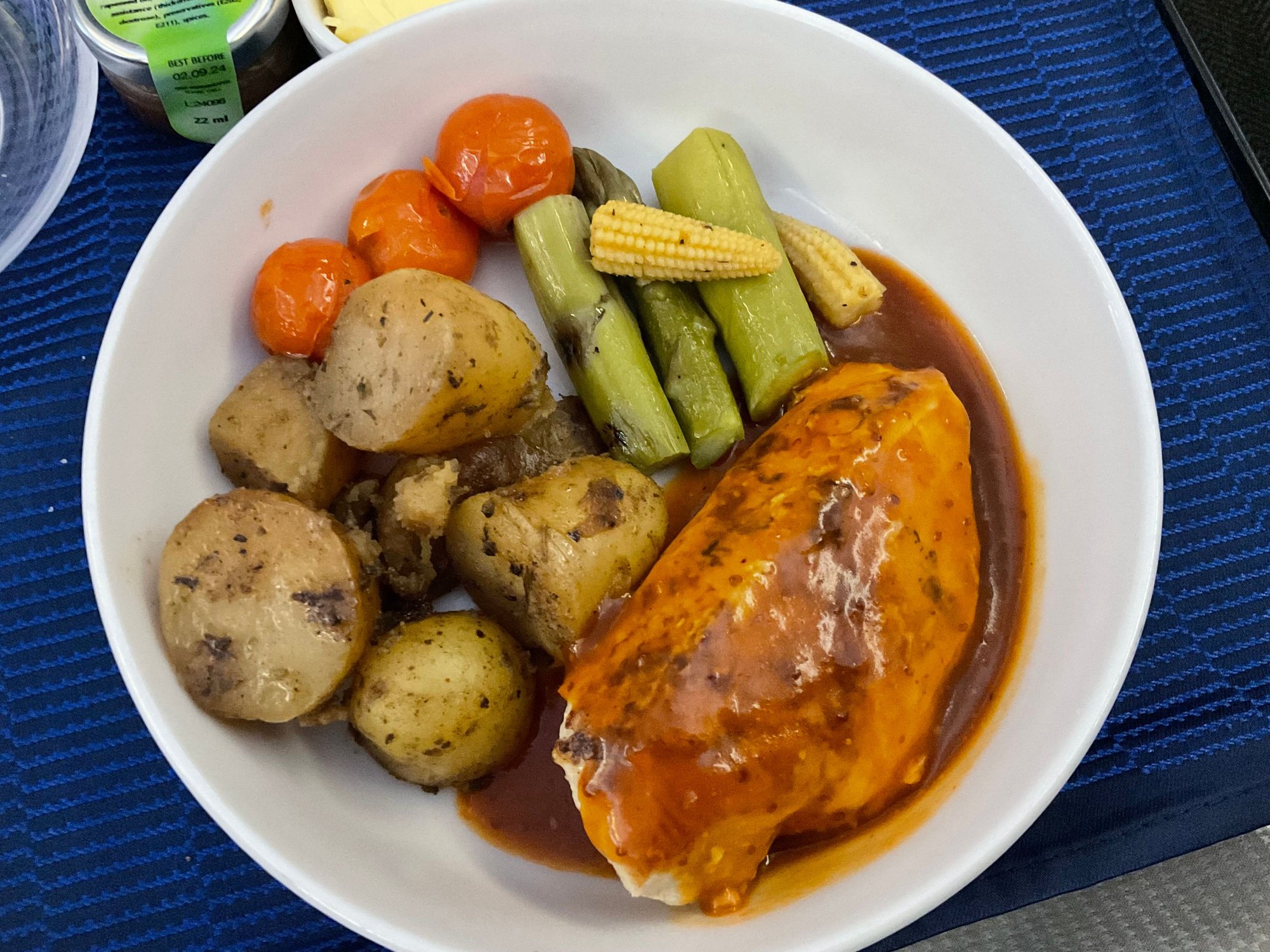 Roast chicken breast with garlic potatoes, grilled asparagus, tomatoes, Cajun corn and Memphis barbecue sauce