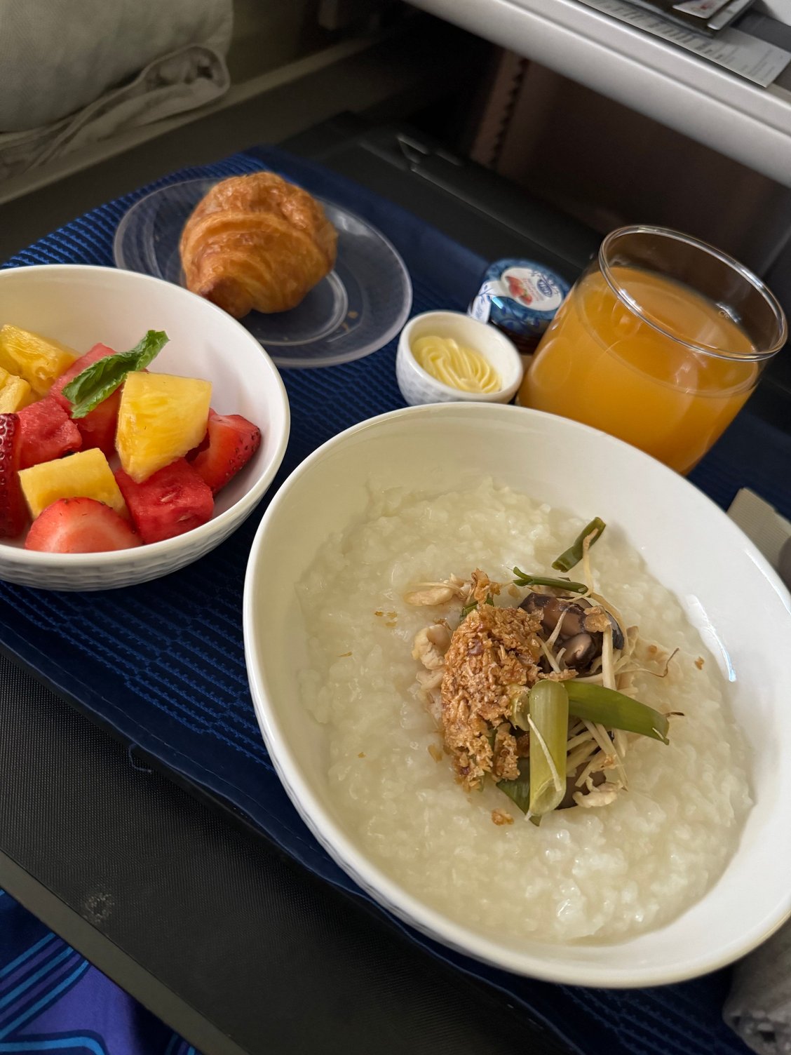 Got the congee again for pre-arrival. This one was seasoned much better and also the croissant was warm, flaky, and buttery; what a surprise!