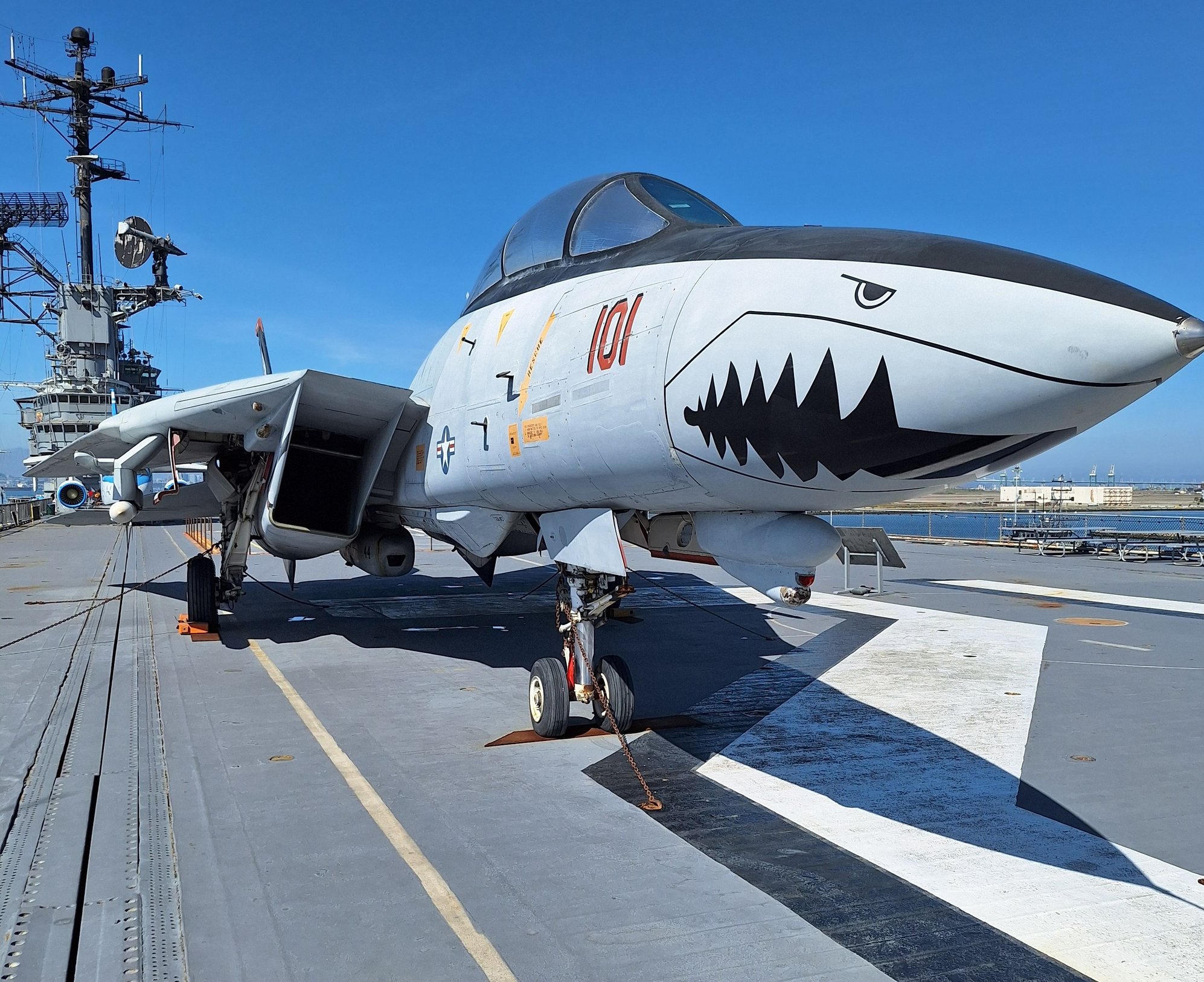 This is an F-14. The Hornet hanger has a wall mural showing all the planes that flew off the carrier up to its retirement in 1970. While the F-14 never flew from this ship I bet it attracts a lot of visitors.