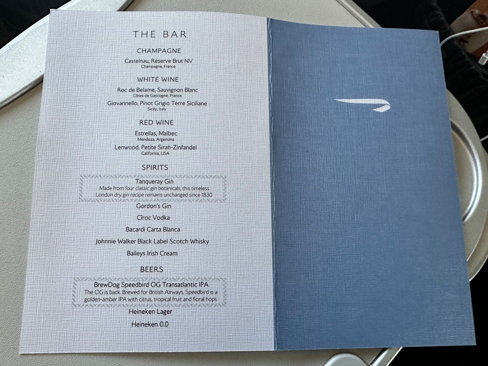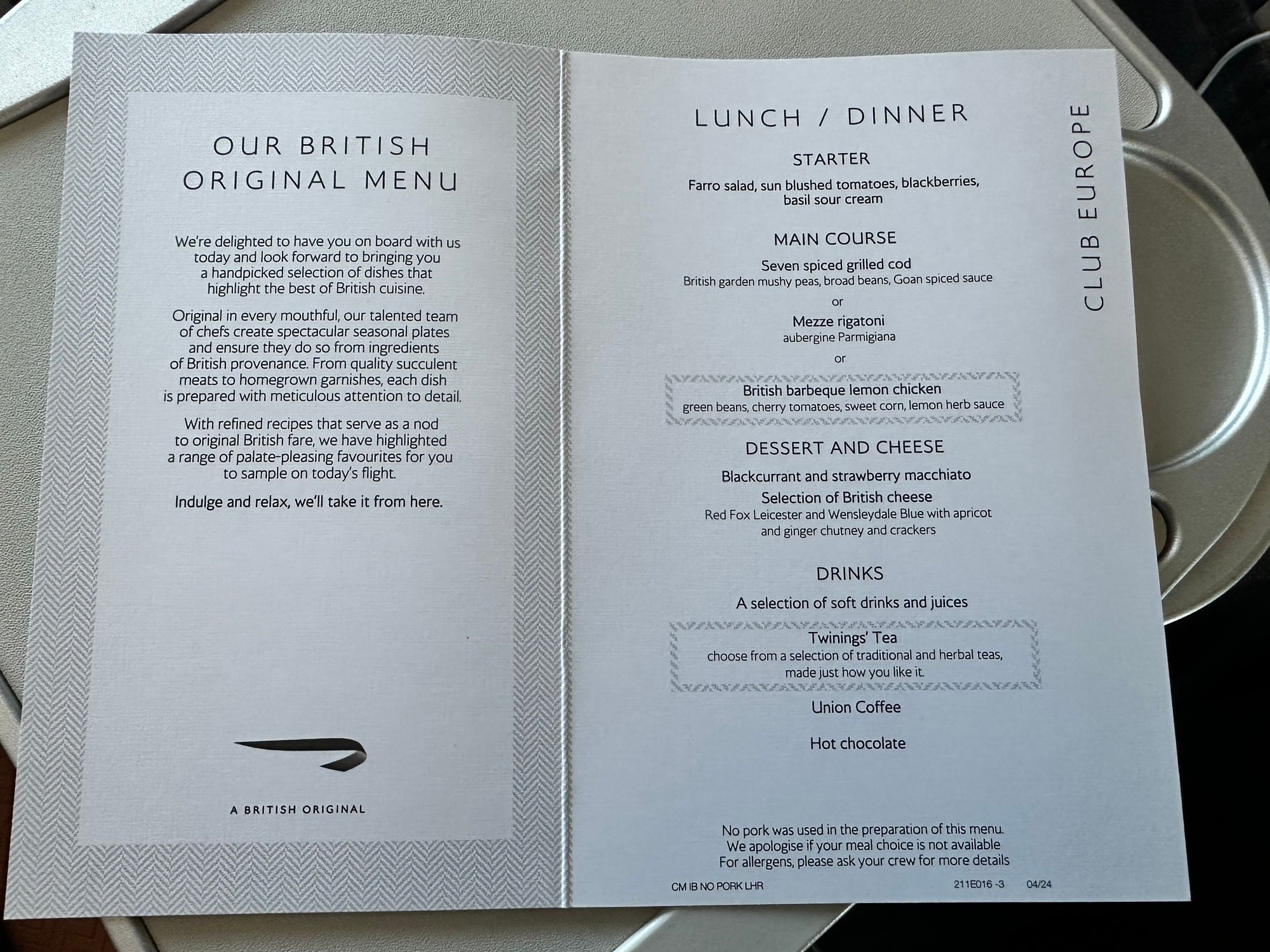 Once the seatbelts were off the menus were quickly distributed and it is a No Pork menu which at the moment is a good thing, no ‘crispy’ pork belly. I’m a bit torn between the cod and the chicken but I think the chicken wins.