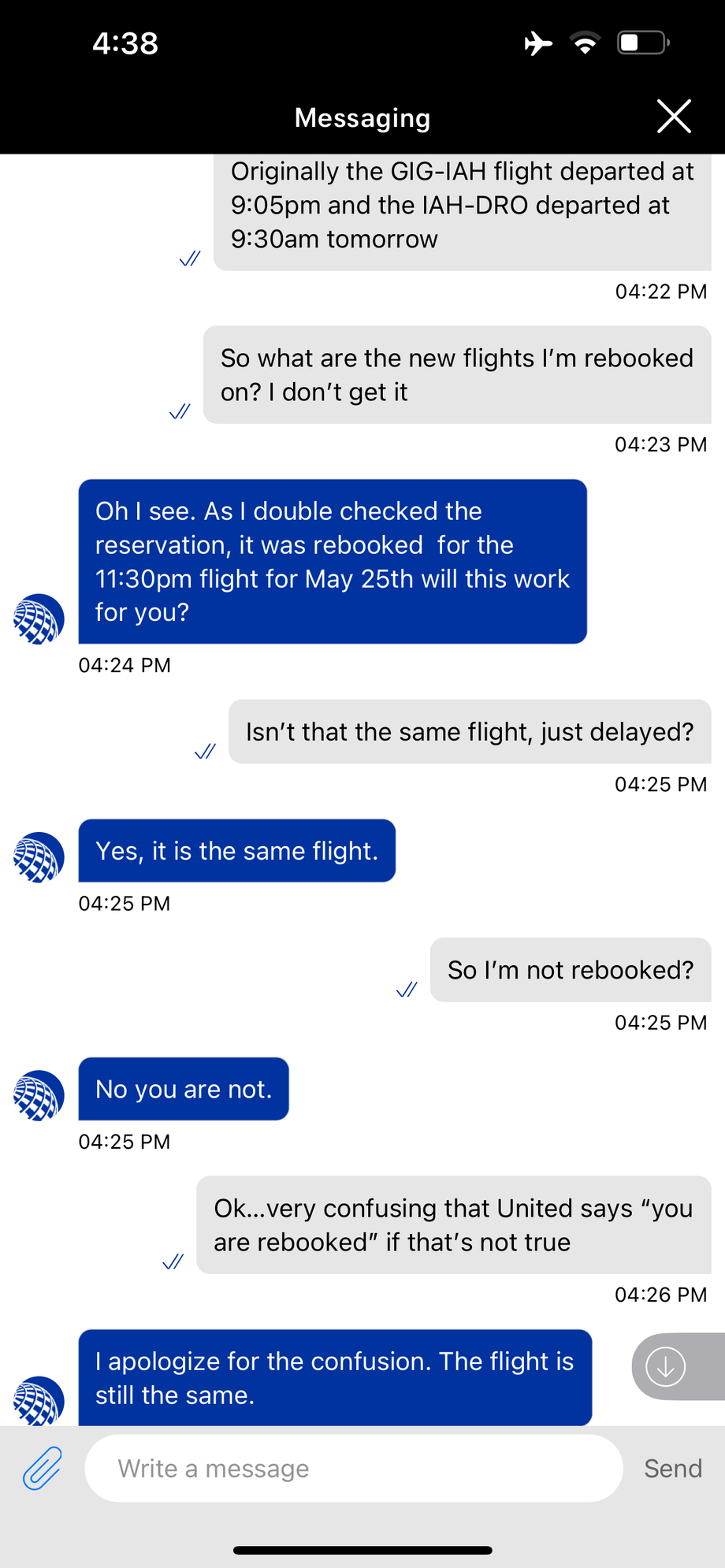 I then chatted the United rep who first said I was rebooked to a later flight and then said that no, I was still on my original flight?
