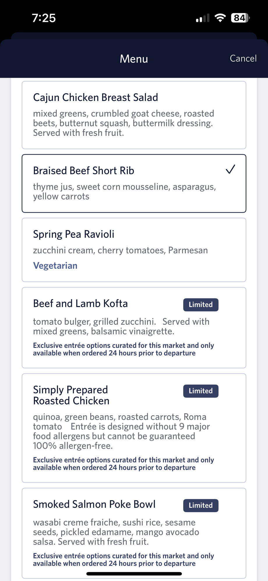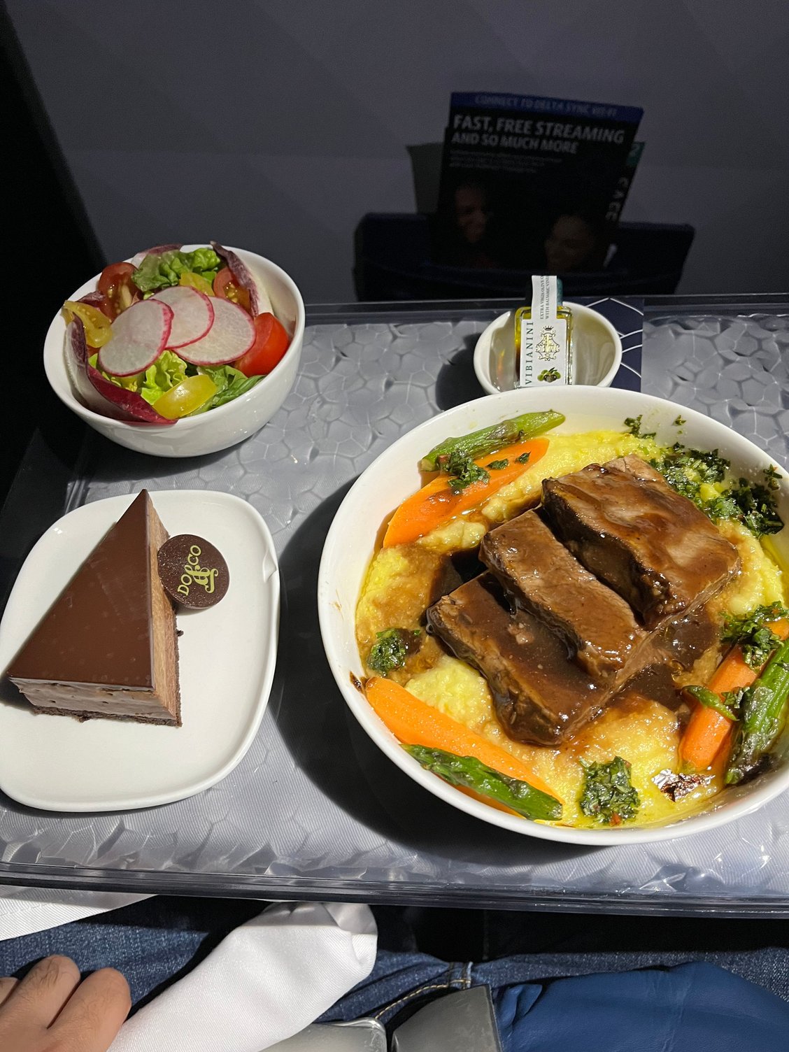 This is the new summer menu short rib selection from Do&Co. The sweet corn mousseline is a very nice choice compared to mashed potatoes or similar. Great corn flavor and not too sweet. Dessert is now a 2-tier chocolate mousse cake, which is better than the advertised chocolate pecan brownie. Good service.