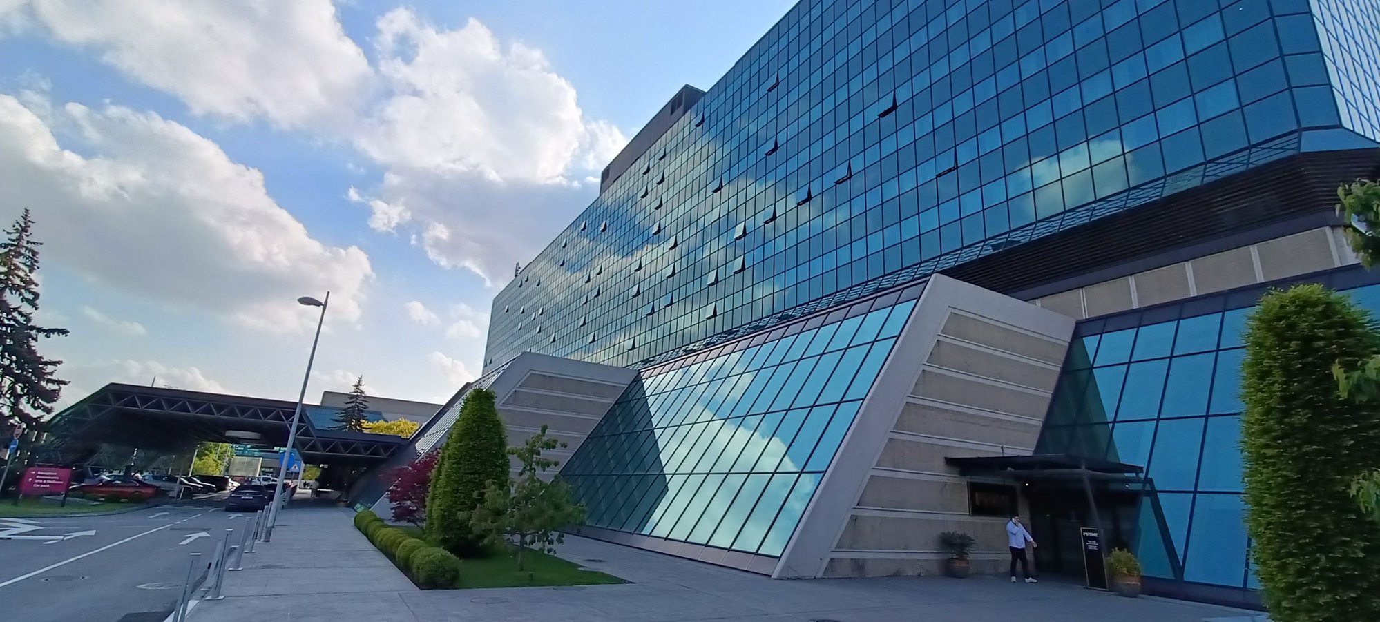 The hotel has a varied history as described in its Wikipedia article. The back of the building connects to the Sava Centar, a conference centre which also hosts a LIDL and a dm (the German drug-mart). When coming from the mall you must buzz security to enter the hotel.