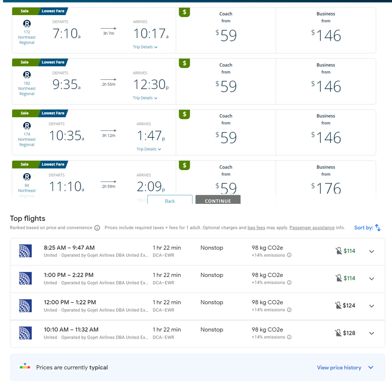 Unless Union Station was extremely convenient for me (v IAD or DCA), I'd probably spend an extra $50 to fly (I randomly chose July 18 for this comparison, but these seem to be pretty consistent weekday fares).