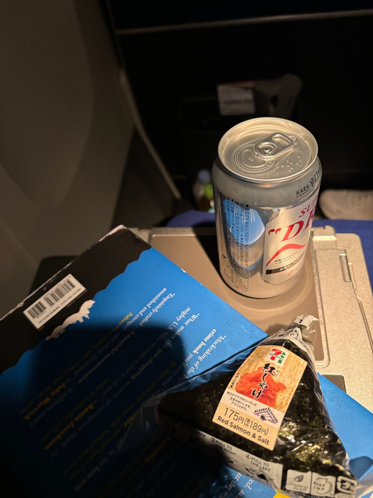 Our tray was cleared 2hrs and 15 min after take off, but the crew kept coming through and offering drinks. Here, another Asahi with some of our 7-11 haul.