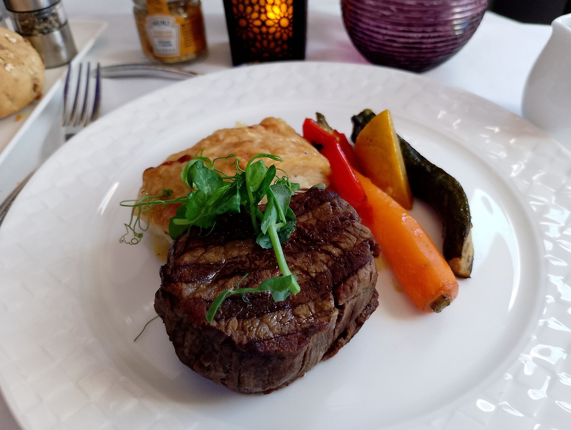 For the main I went with the grilled Black Angus beef fillet with herb jus and potato dauphinoise and summer veggies. I liked that it came with a small mustard jar too.