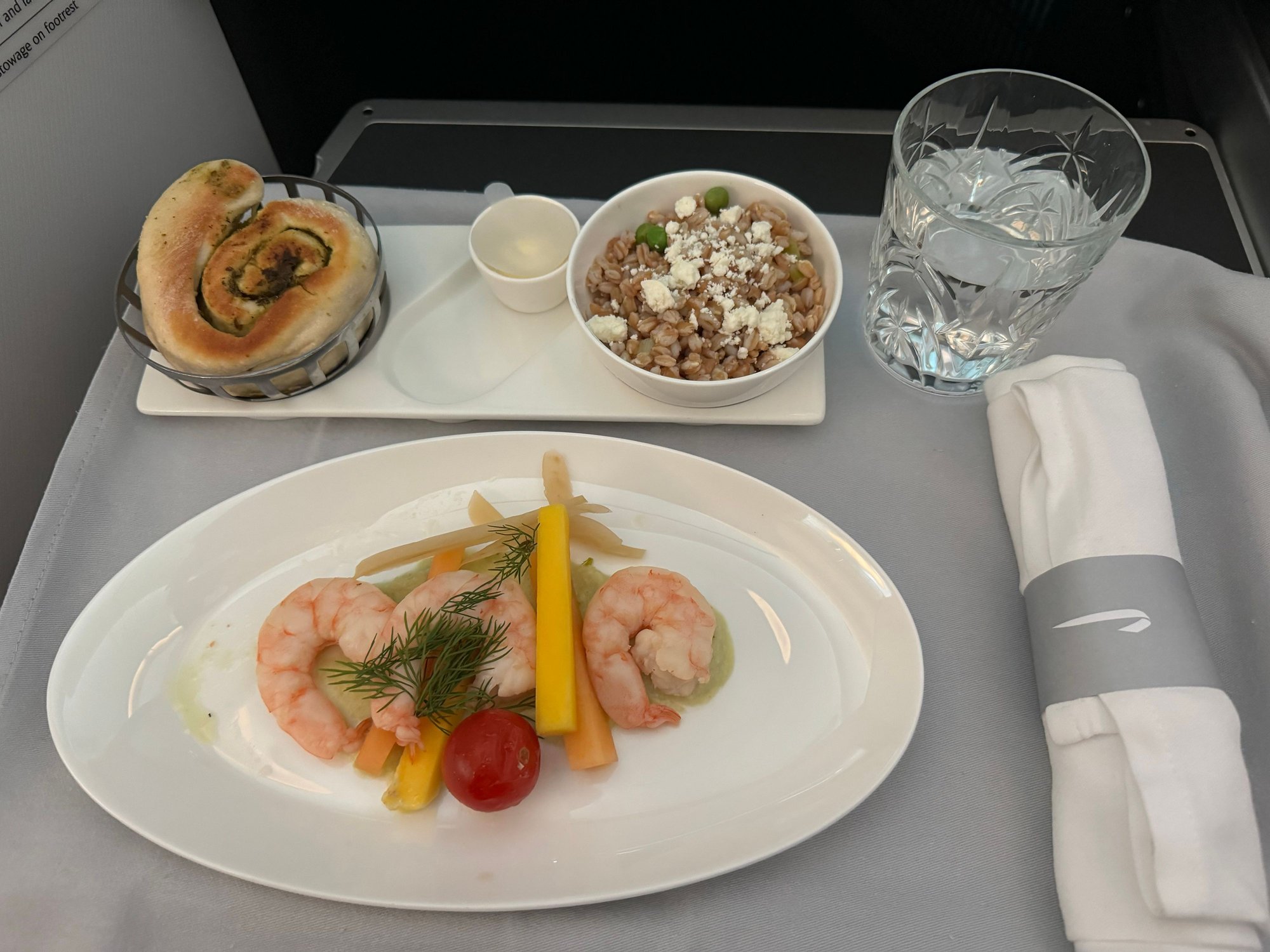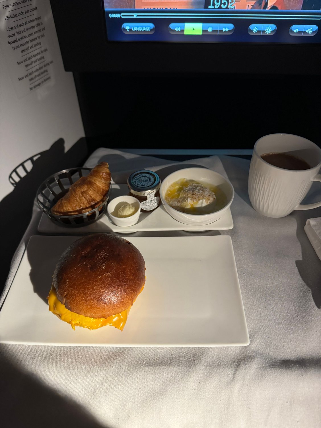 Overall, the food was a disappointment. The prawn starter was ok, but lacked flavour. The fish was very overdone and had dried out. The bread pudding was the only course I quite enjoyed. I thought the breakfast offering was insubstantial for a flight of this length and brioche roll could have knocked someone out. The champagne and Sauvignon Blanc were not well chilled, so didn’t particularly enjoy those either.