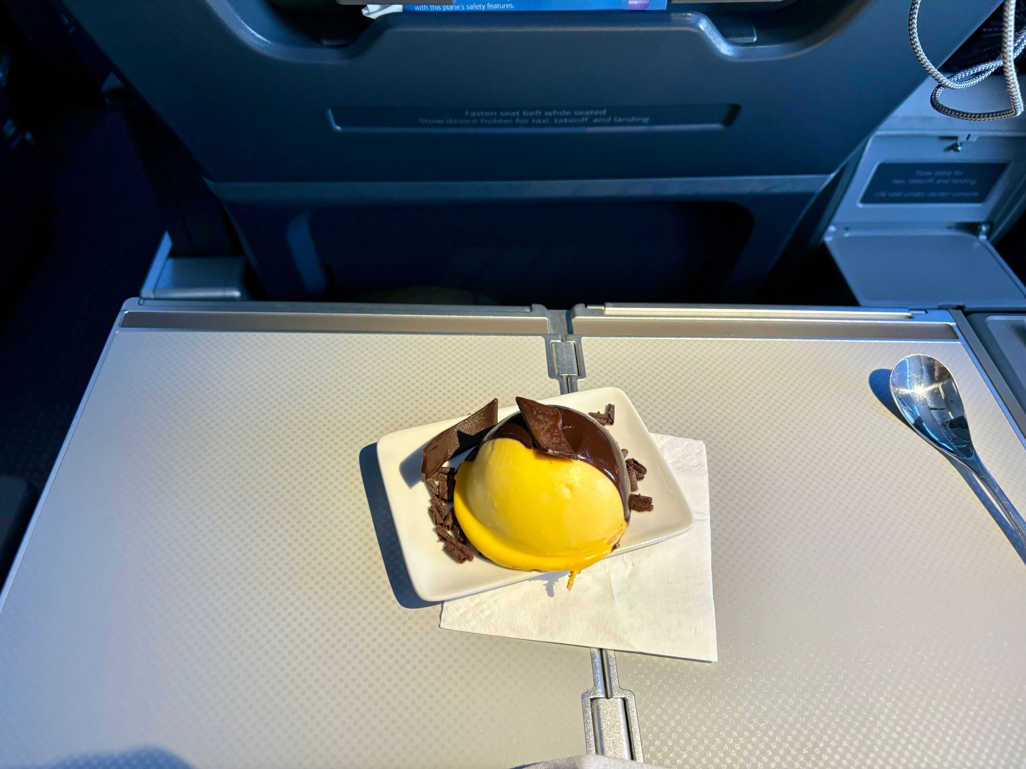 Had the ricotta and sundried tomato ravioli with mushroom cream sauce and asparagus with an insane chocolate dome as dessert. As usual MEX catering lives up again to the title of best AA catering imho. The main was especially good, arguably the best thing I’ve ever eaten on AA (I think the round dishes help with the reheating since there’s more room). The dome dessert, as previous reported here, is absolutely decadent and huge. Honestly if it was served on a larger plate, it would be indistinguishable from a dessert on QR or TK. Also gotta say I had probably the best crew I’ve ever had on AA and the lead FA was great about coursing an otherwise 1 tray meal, offering multiple top ups before, during, and after service, and was genuinely a super nice to every pax; something you don’t see much in AA nowadays. With the high level of catering and the great crew, for a sec I was thinking I was on a 5 star Asian/ME carrier and not AA (but then I realized I was in an uncomfortable Kodiak seat and I was brought back to reality).